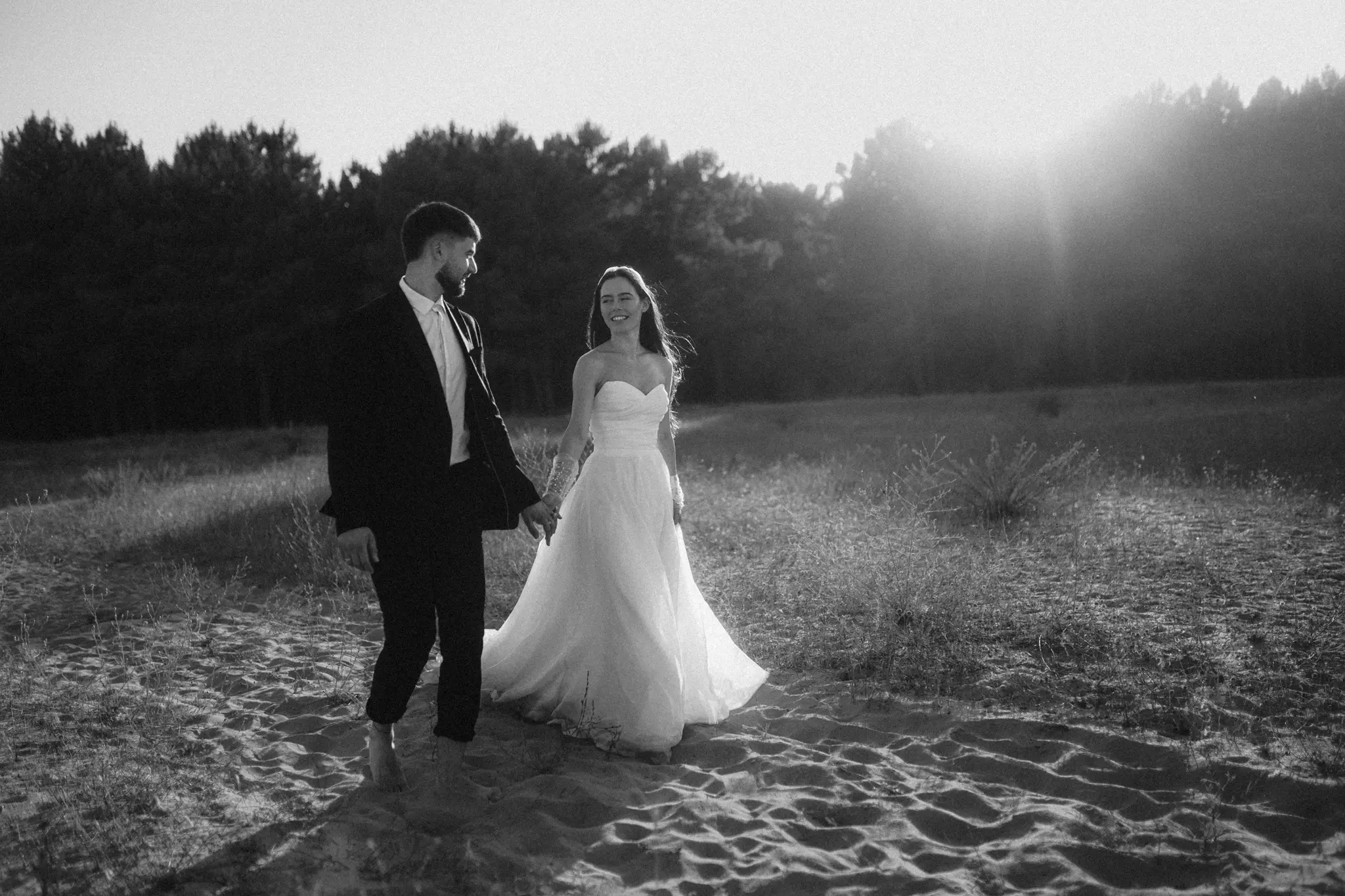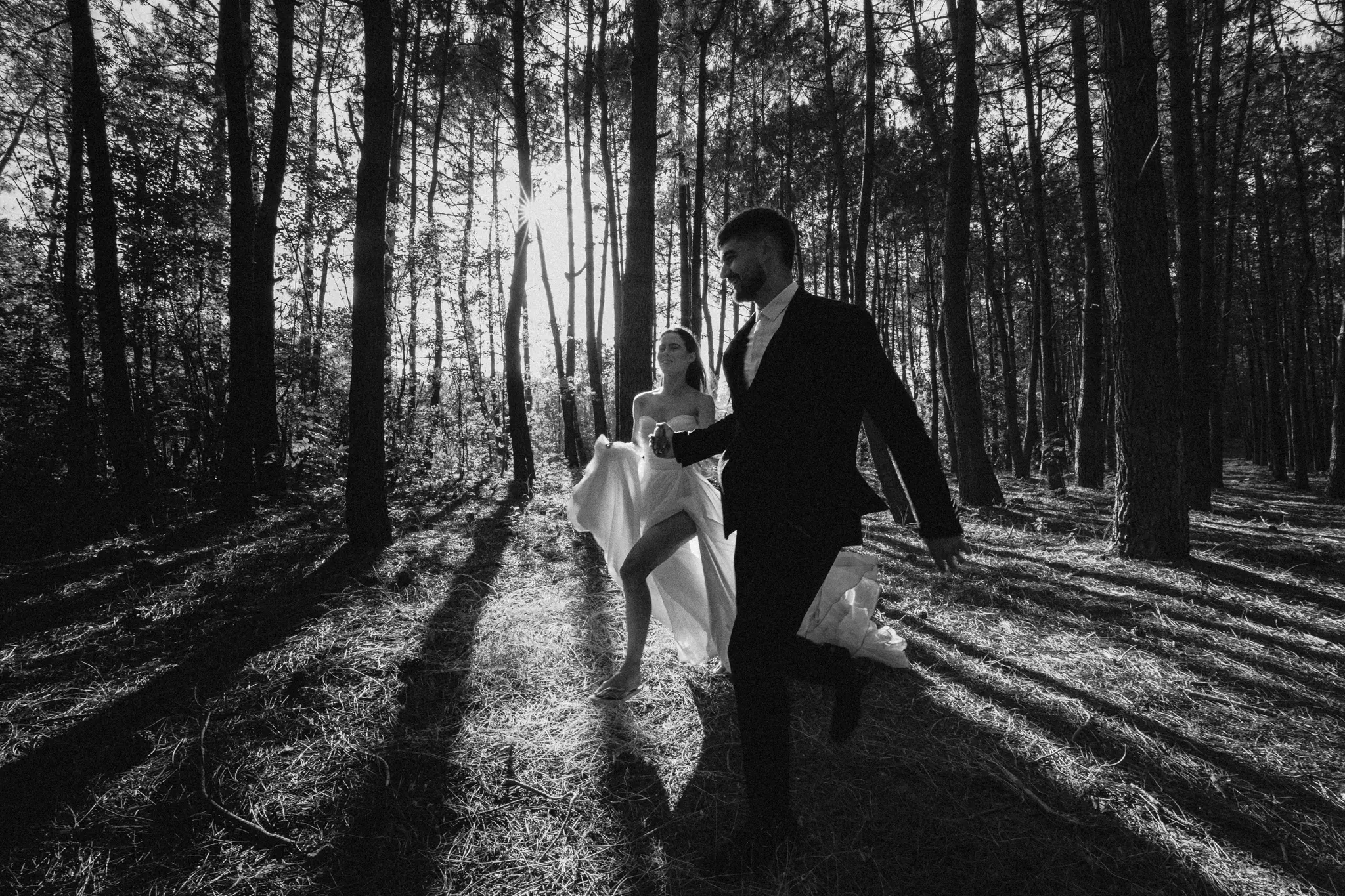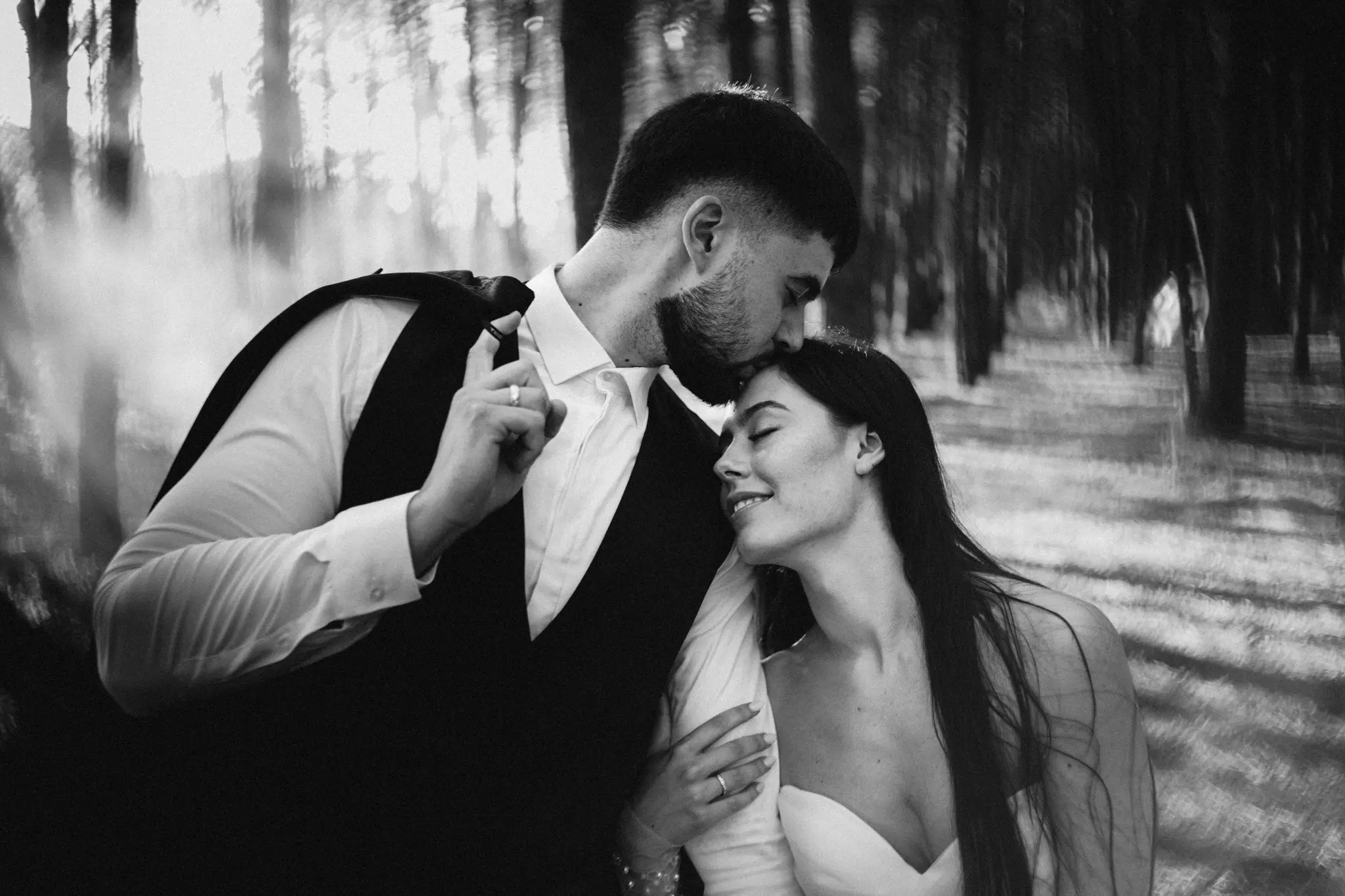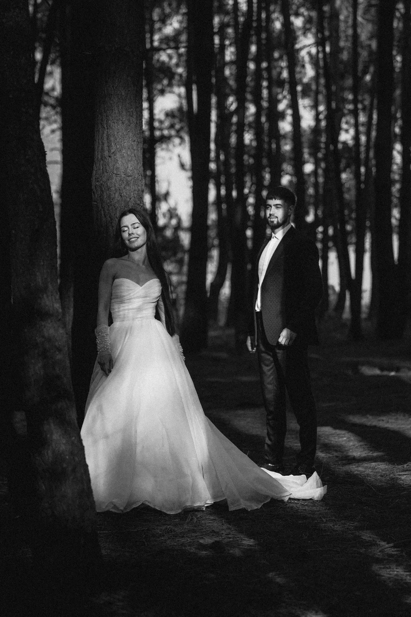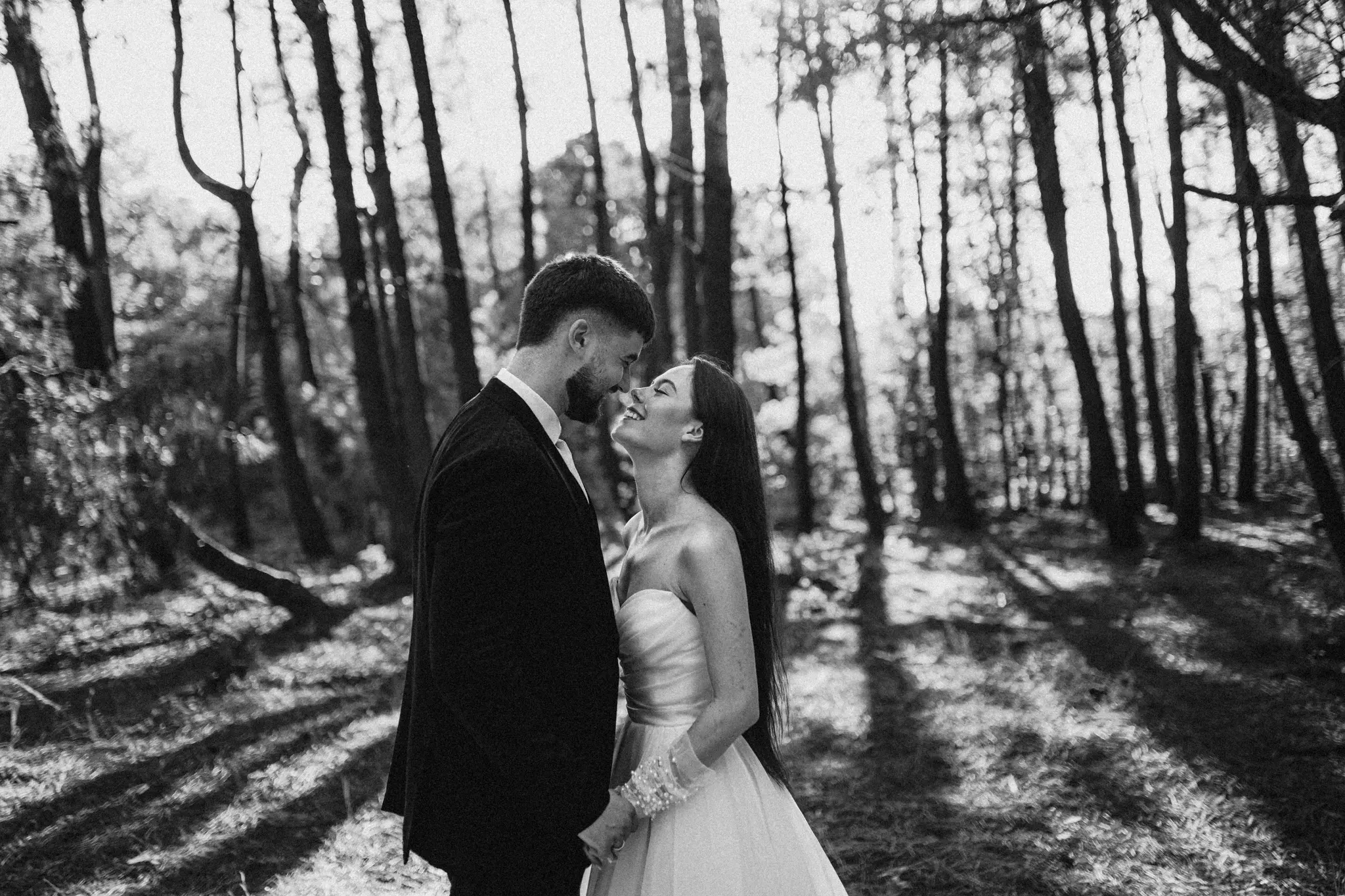 СледСватбена фотосесия в гората и плажа в черно бяло