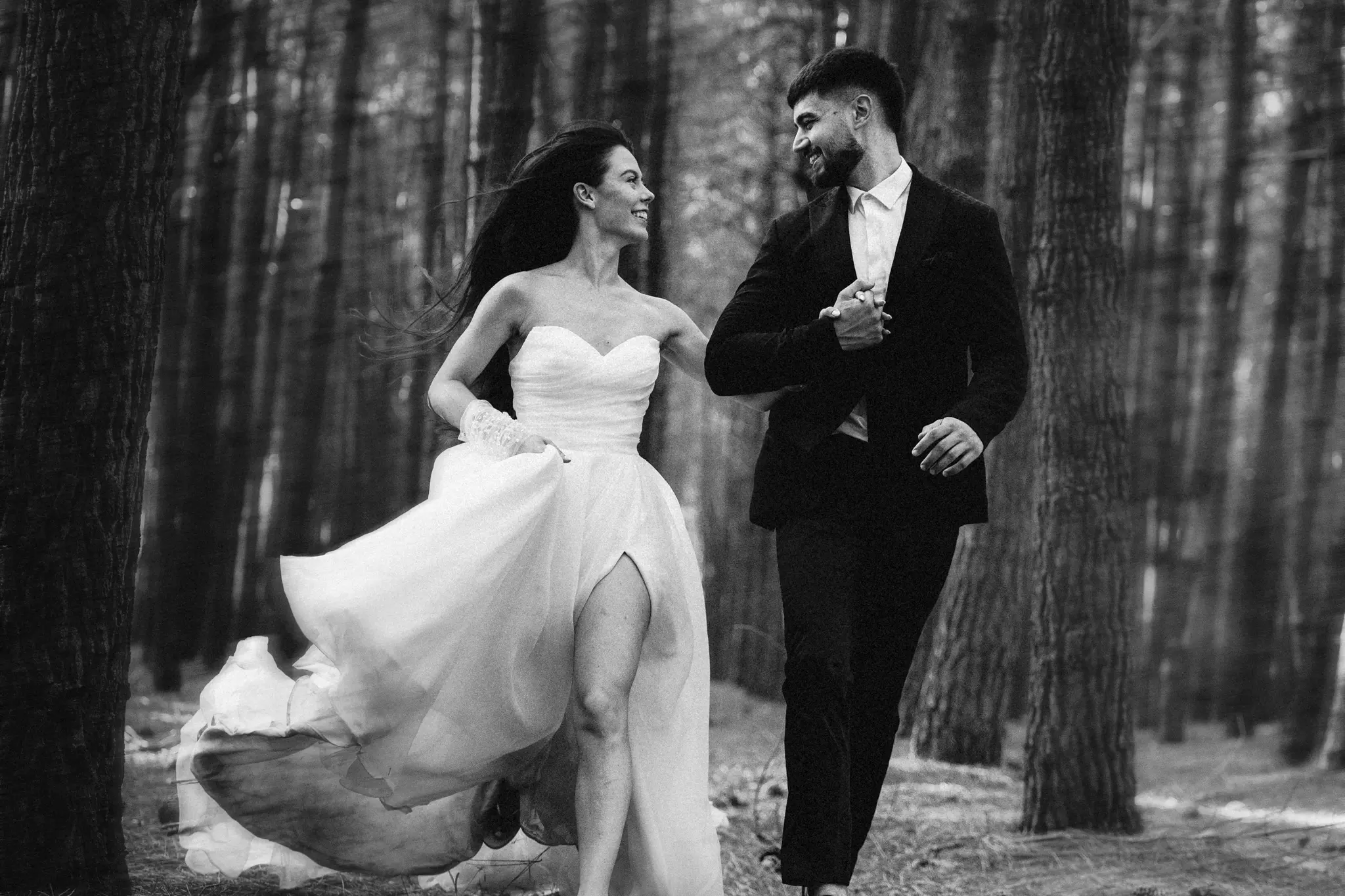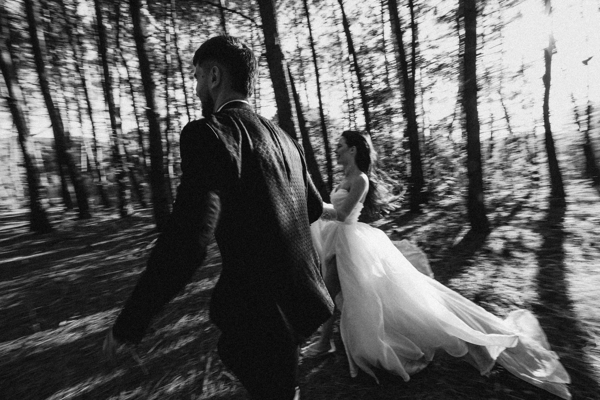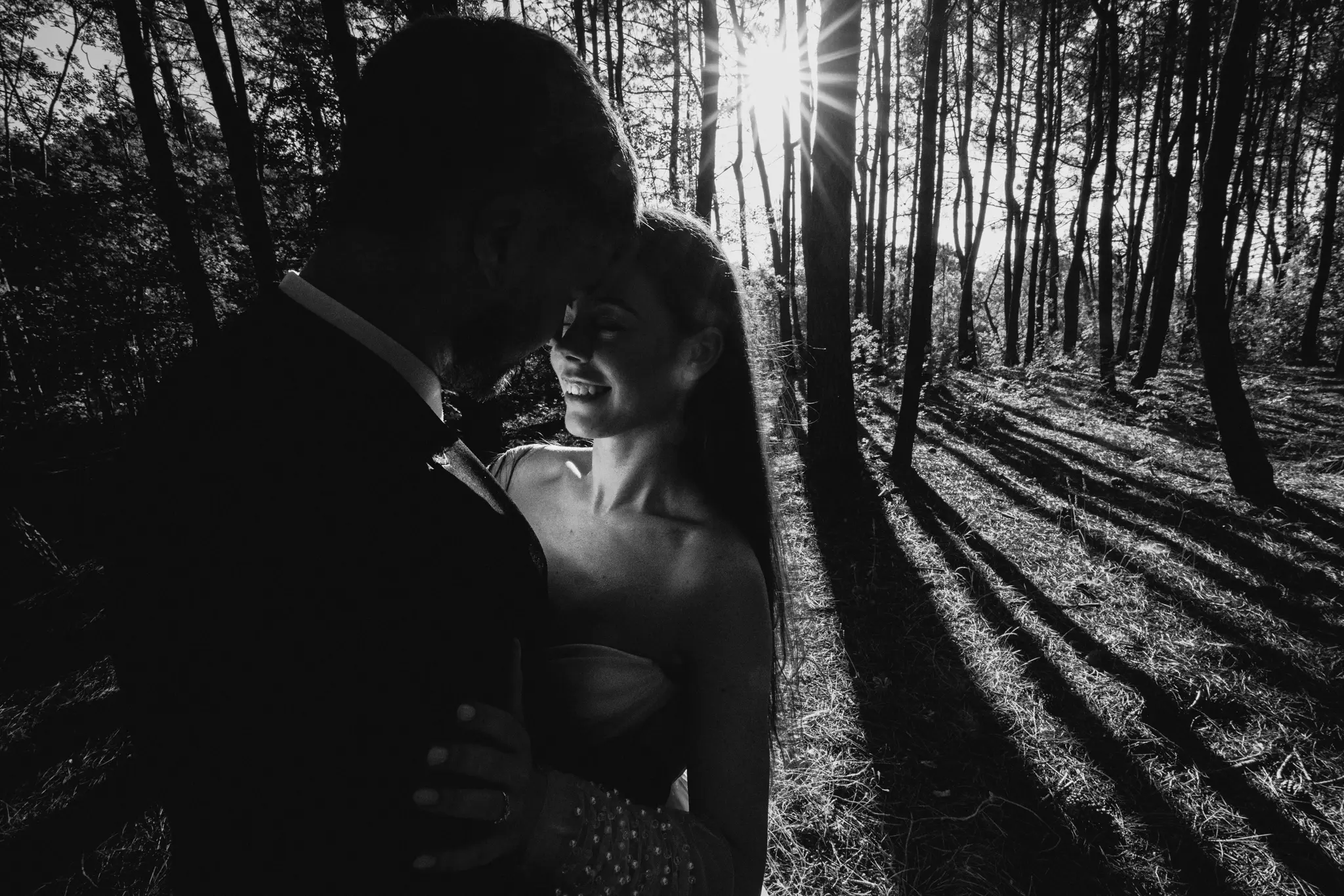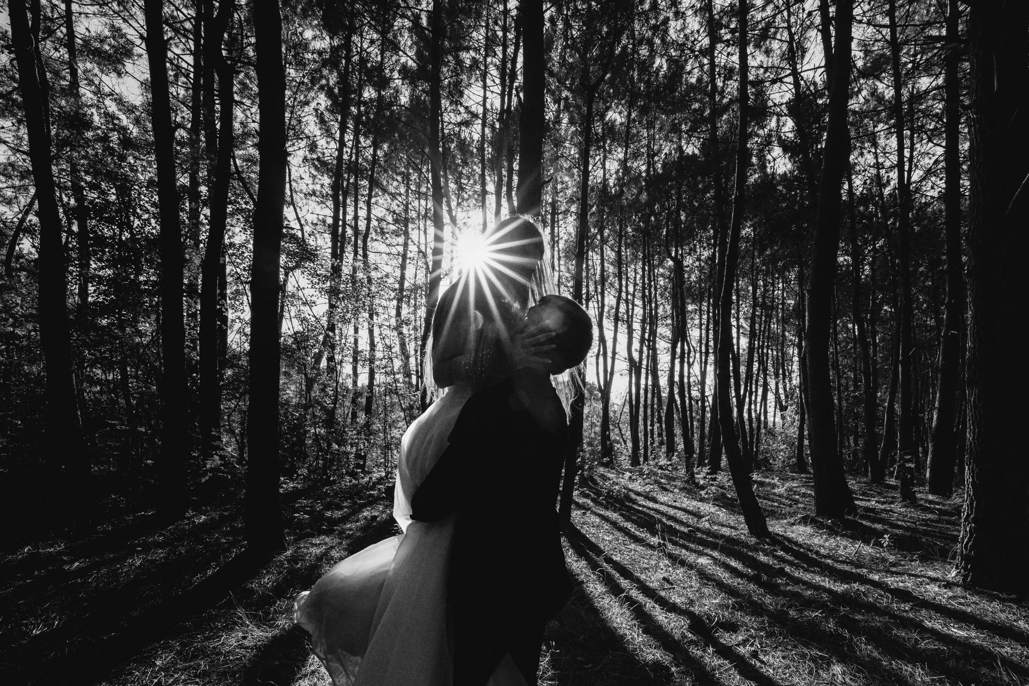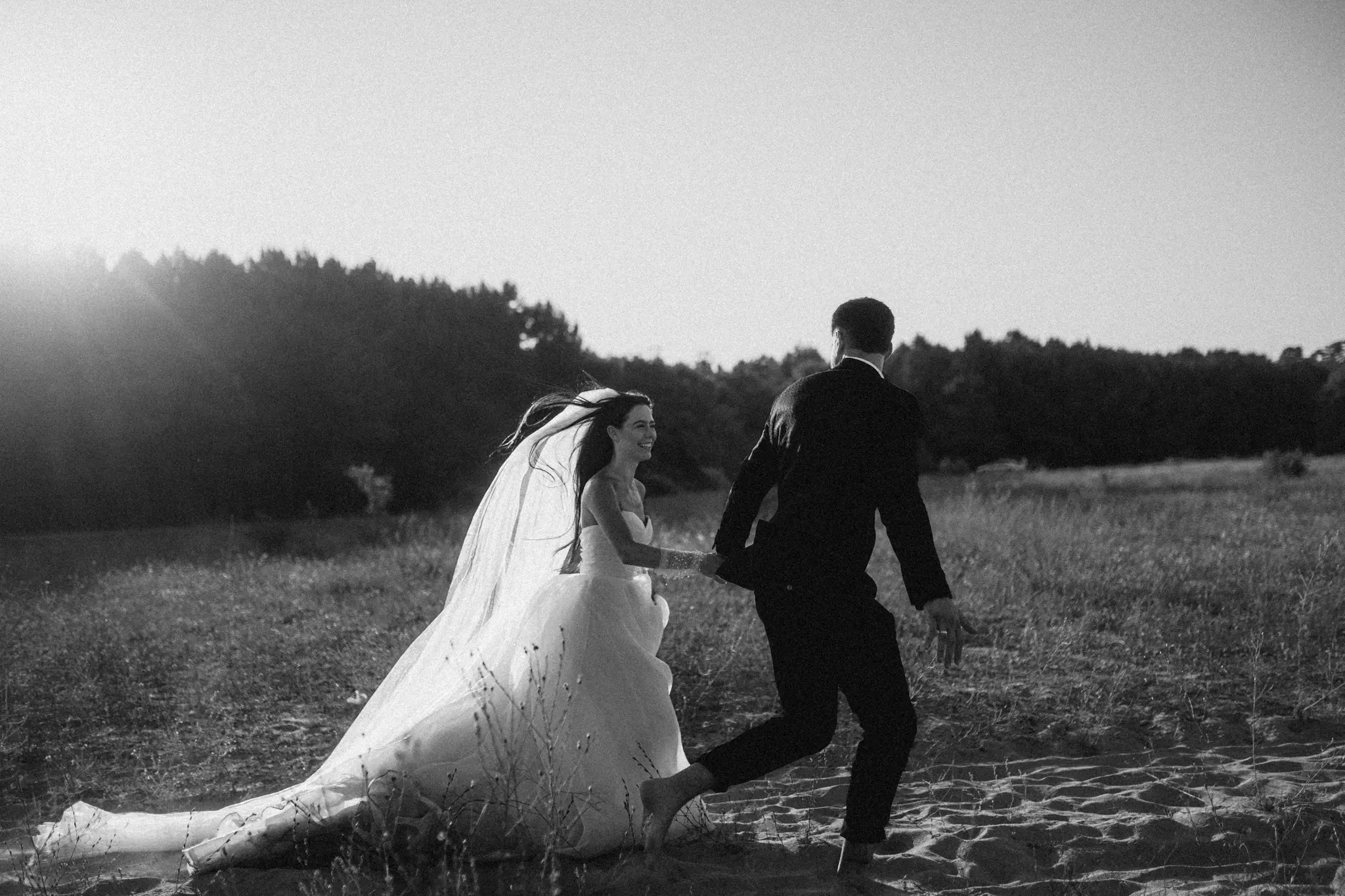 СледСватбена фотосесия в гората и плажа в черно бяло