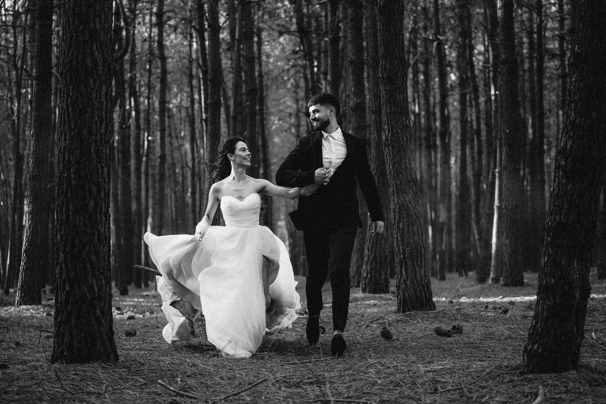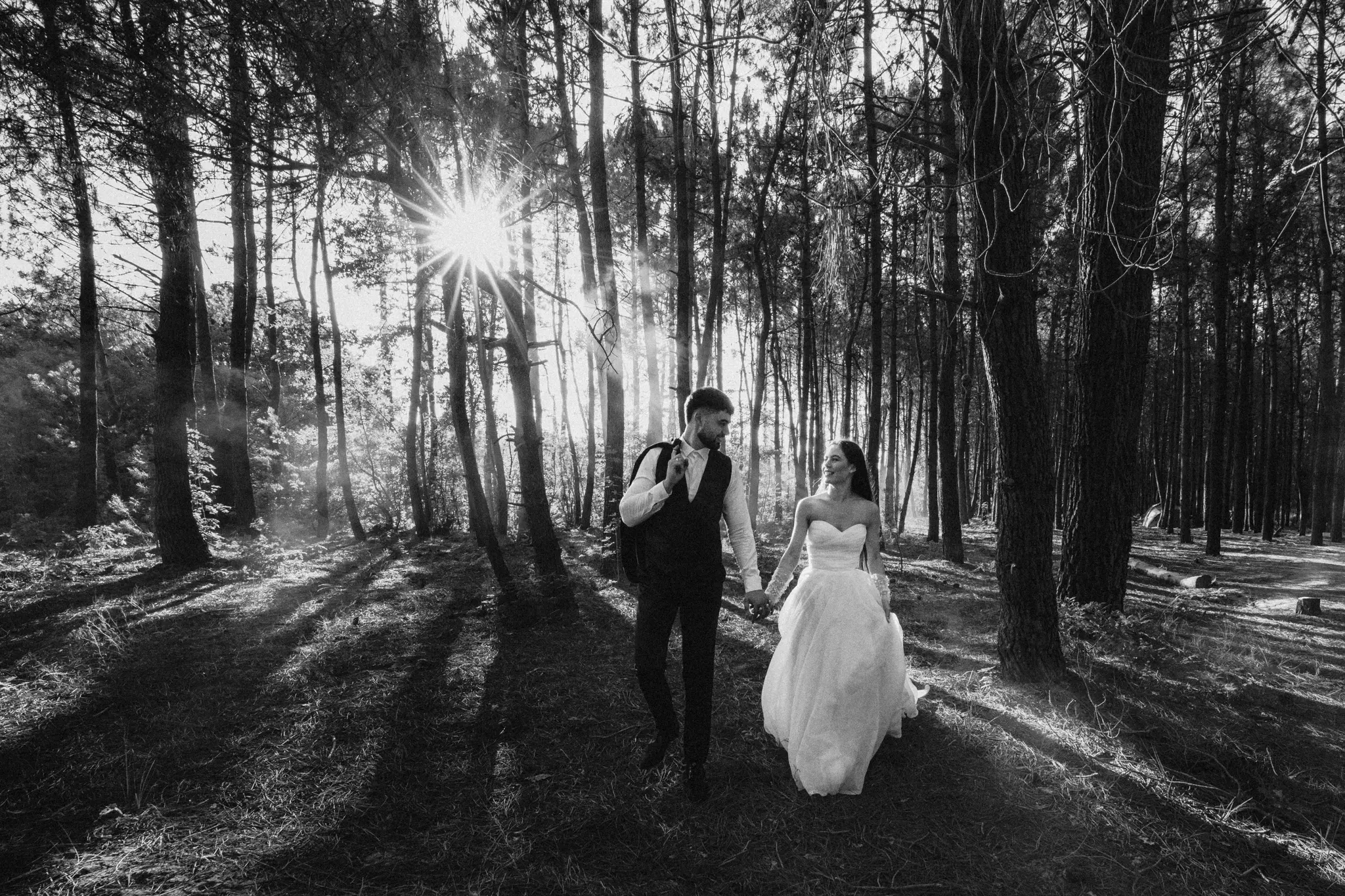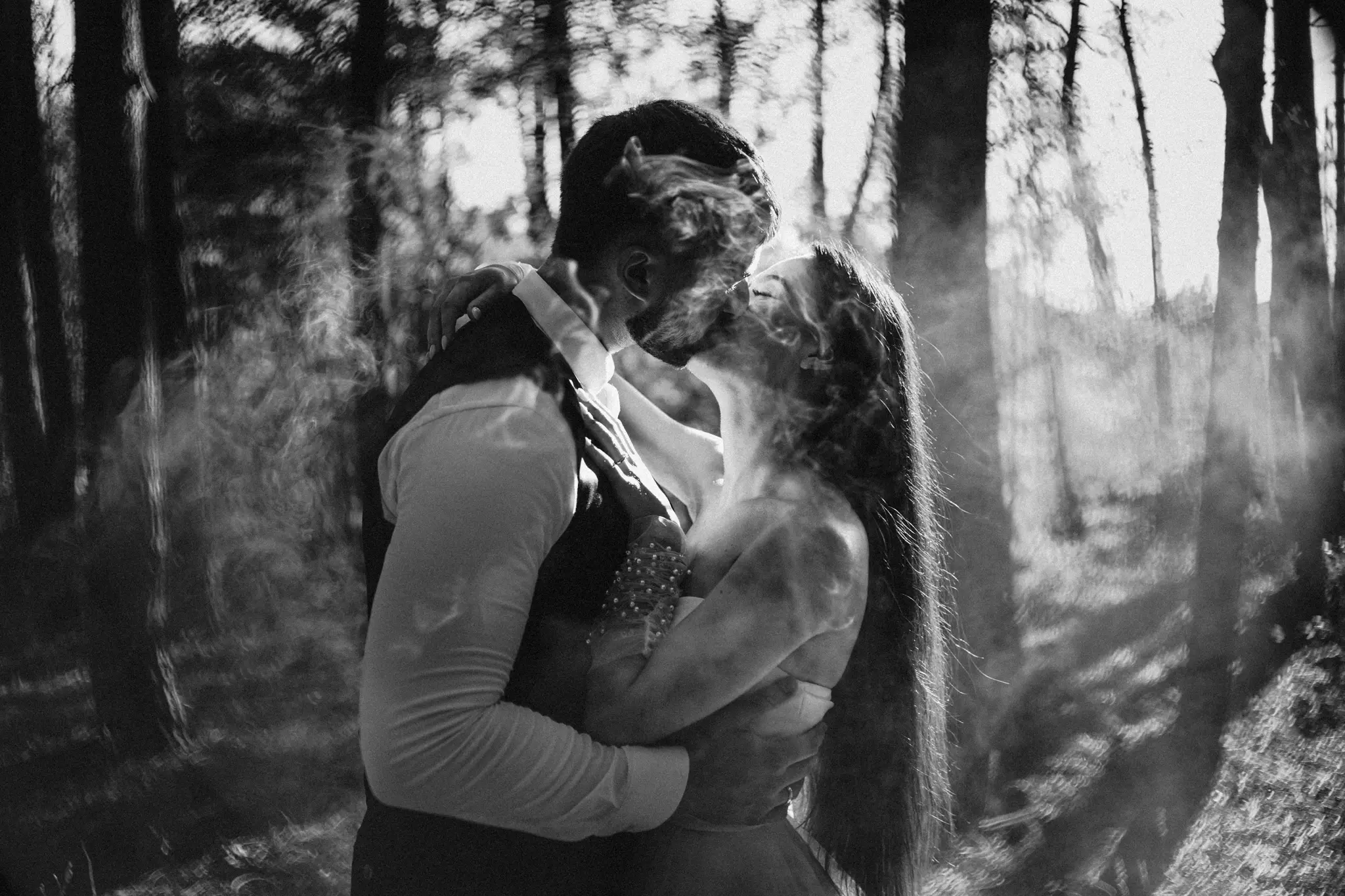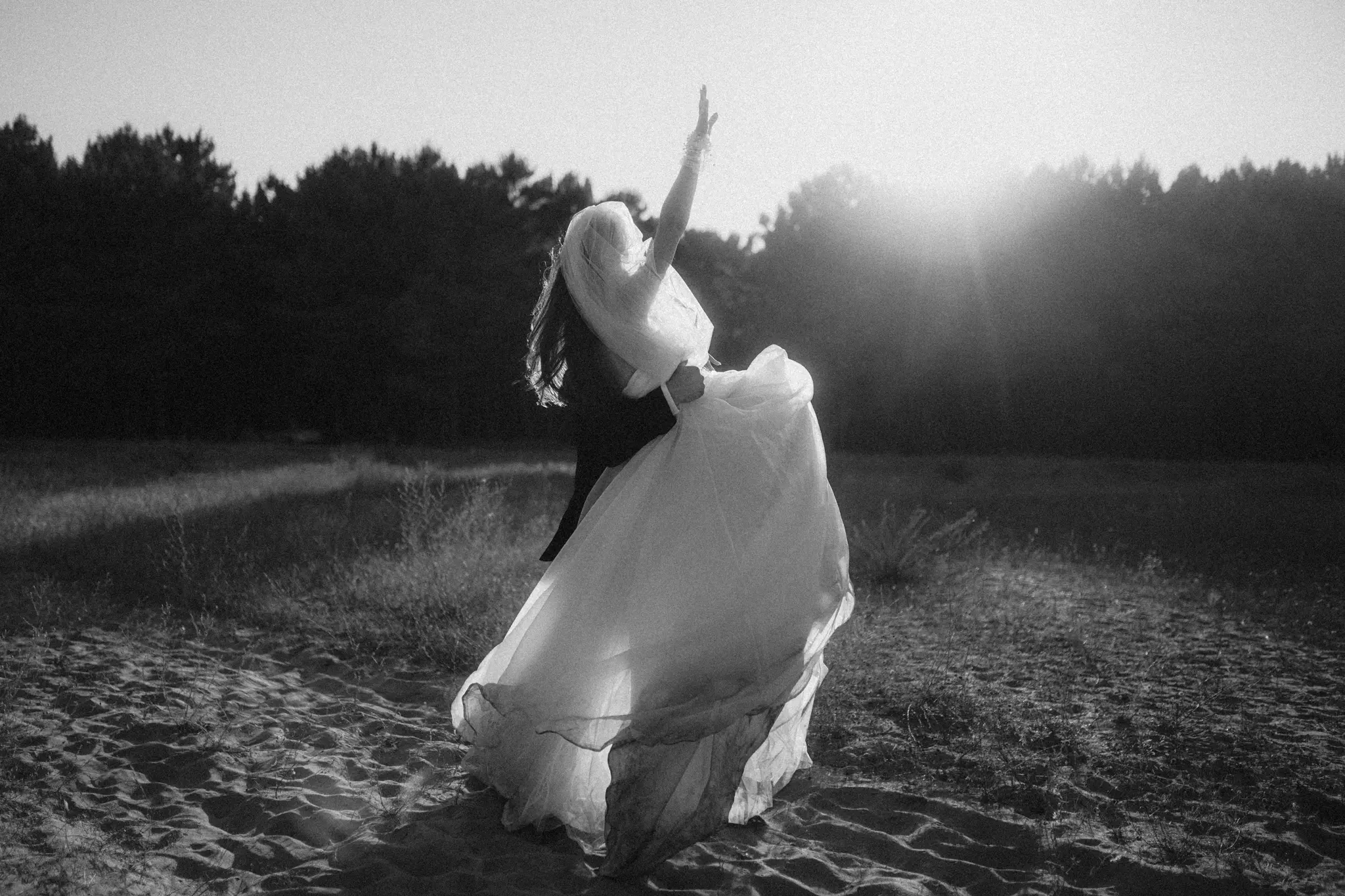 СледСватбена фотосесия в гората и плажа в черно бяло