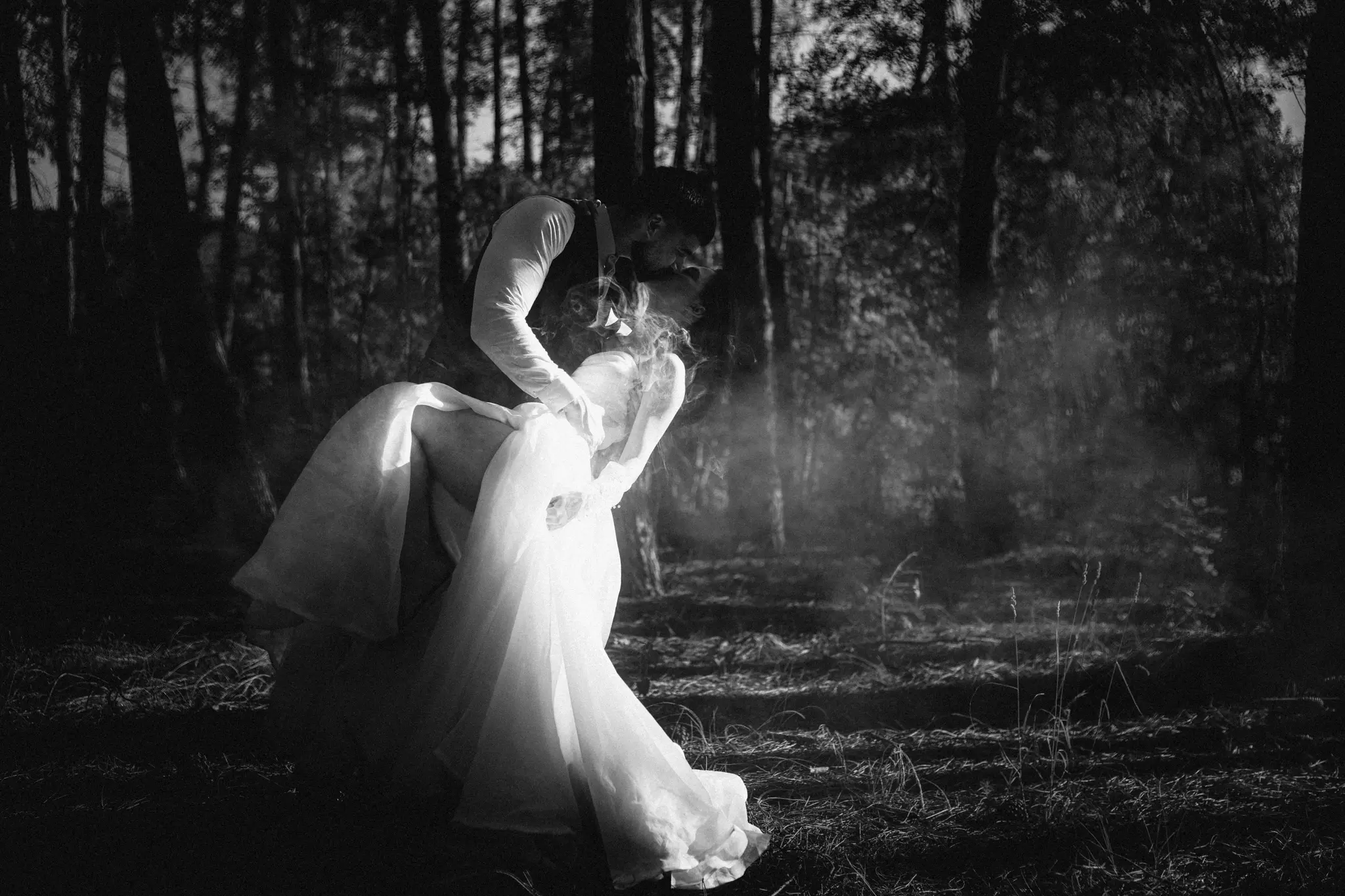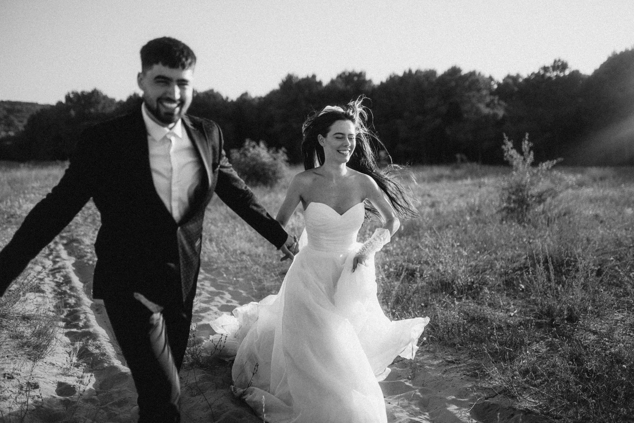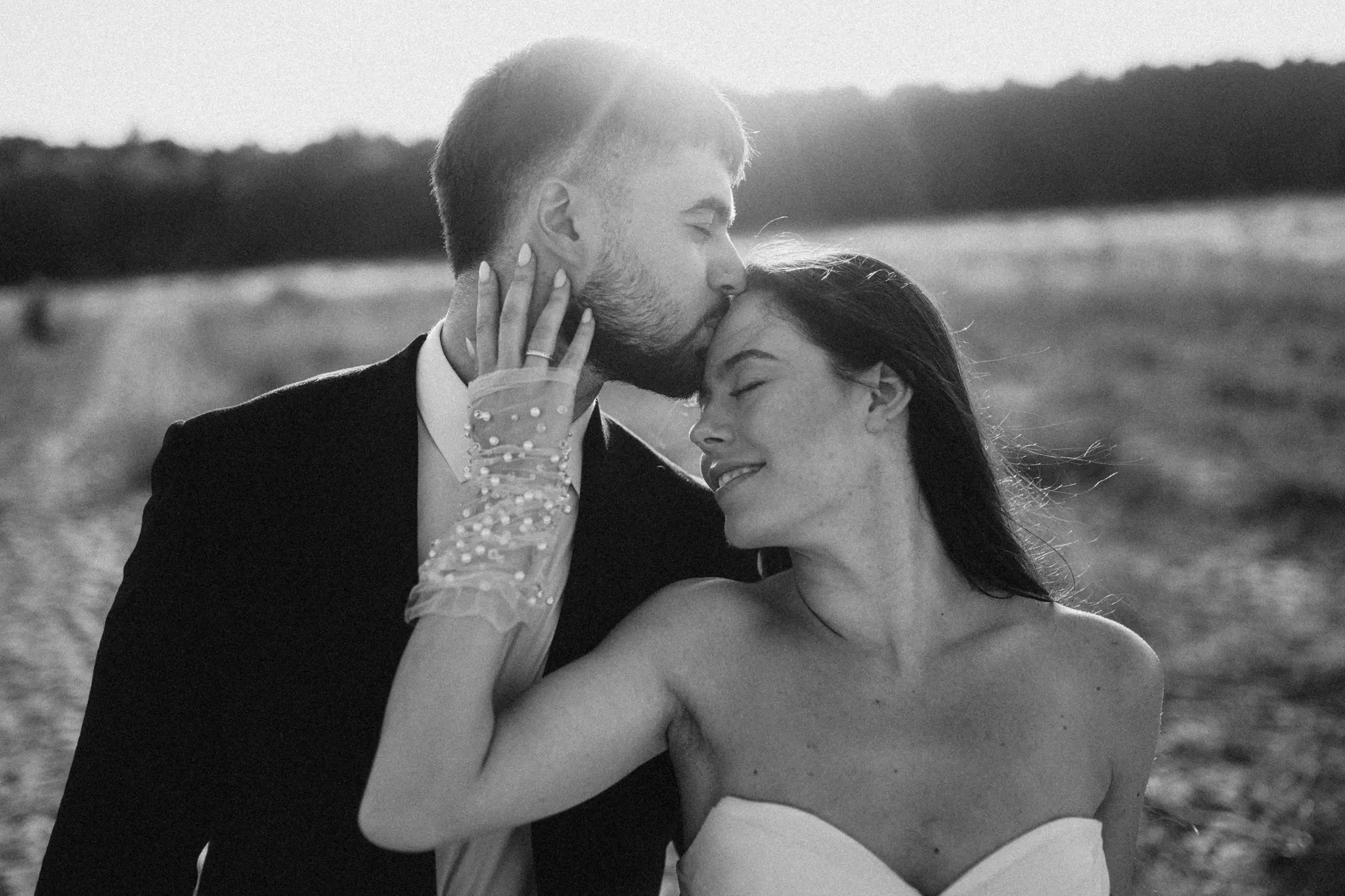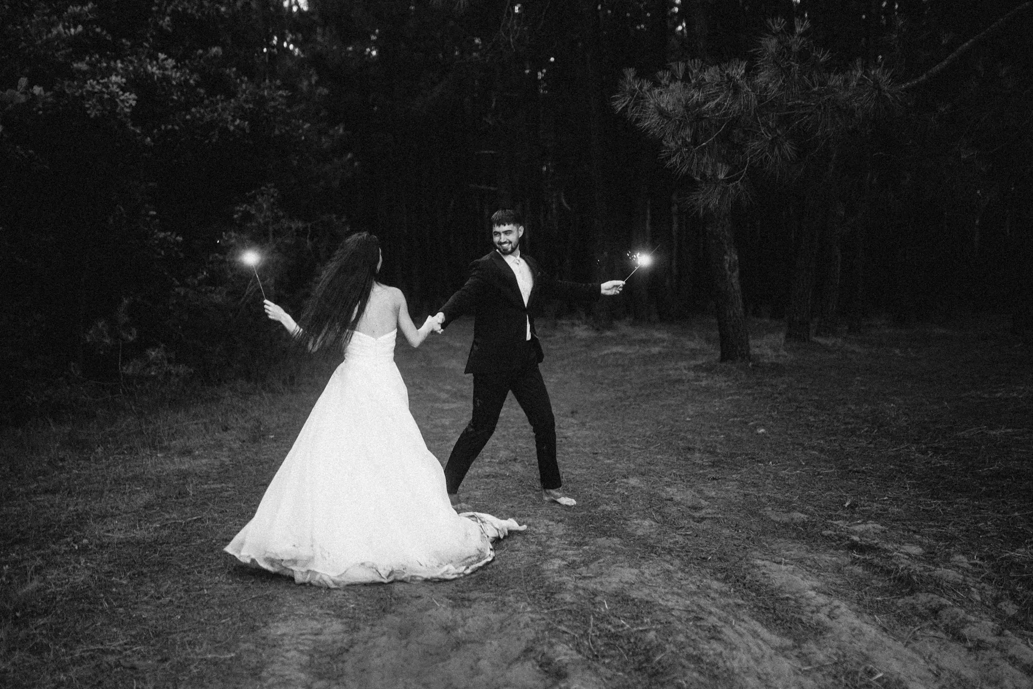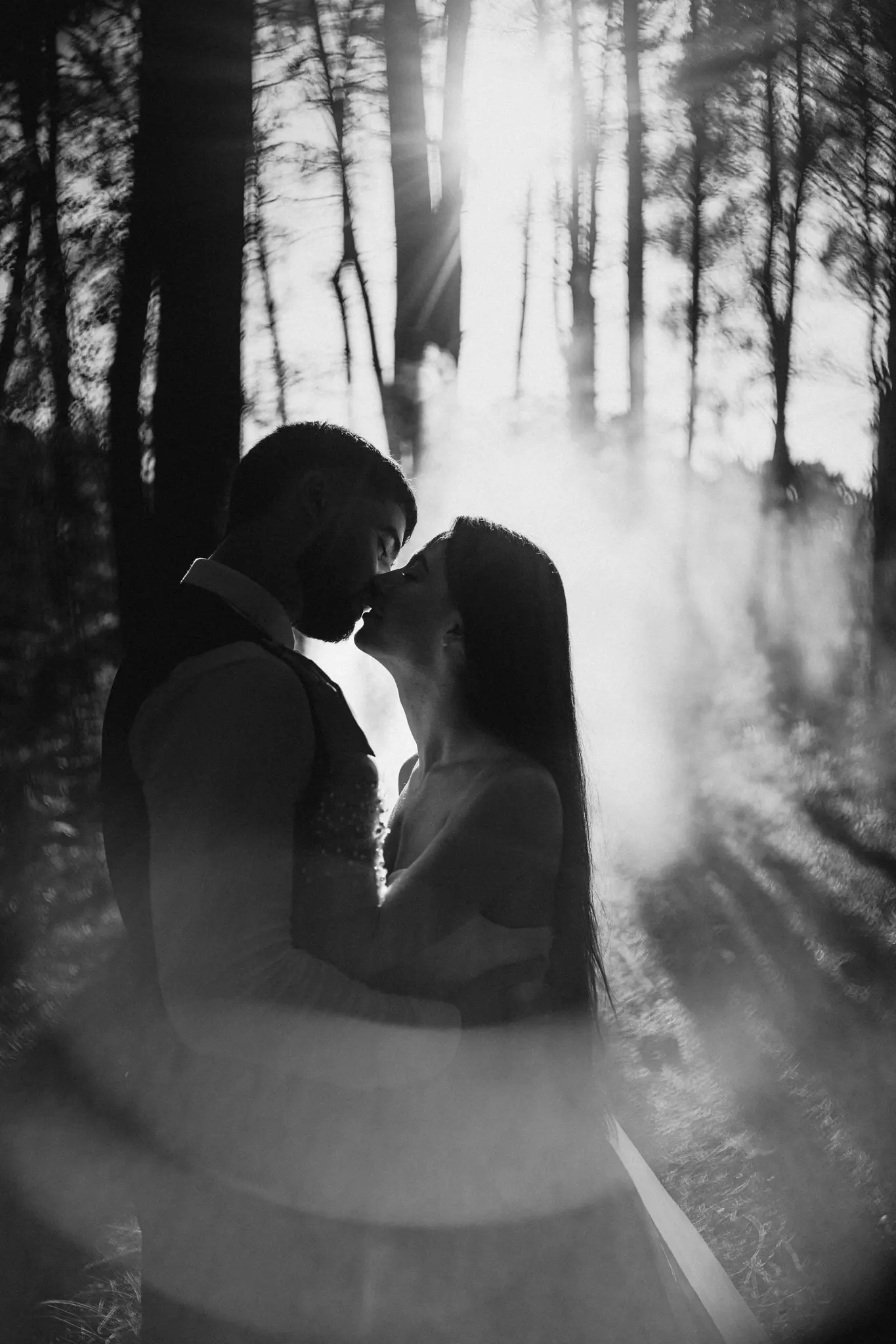 СледСватбена фотосесия в гората и плажа в черно бяло