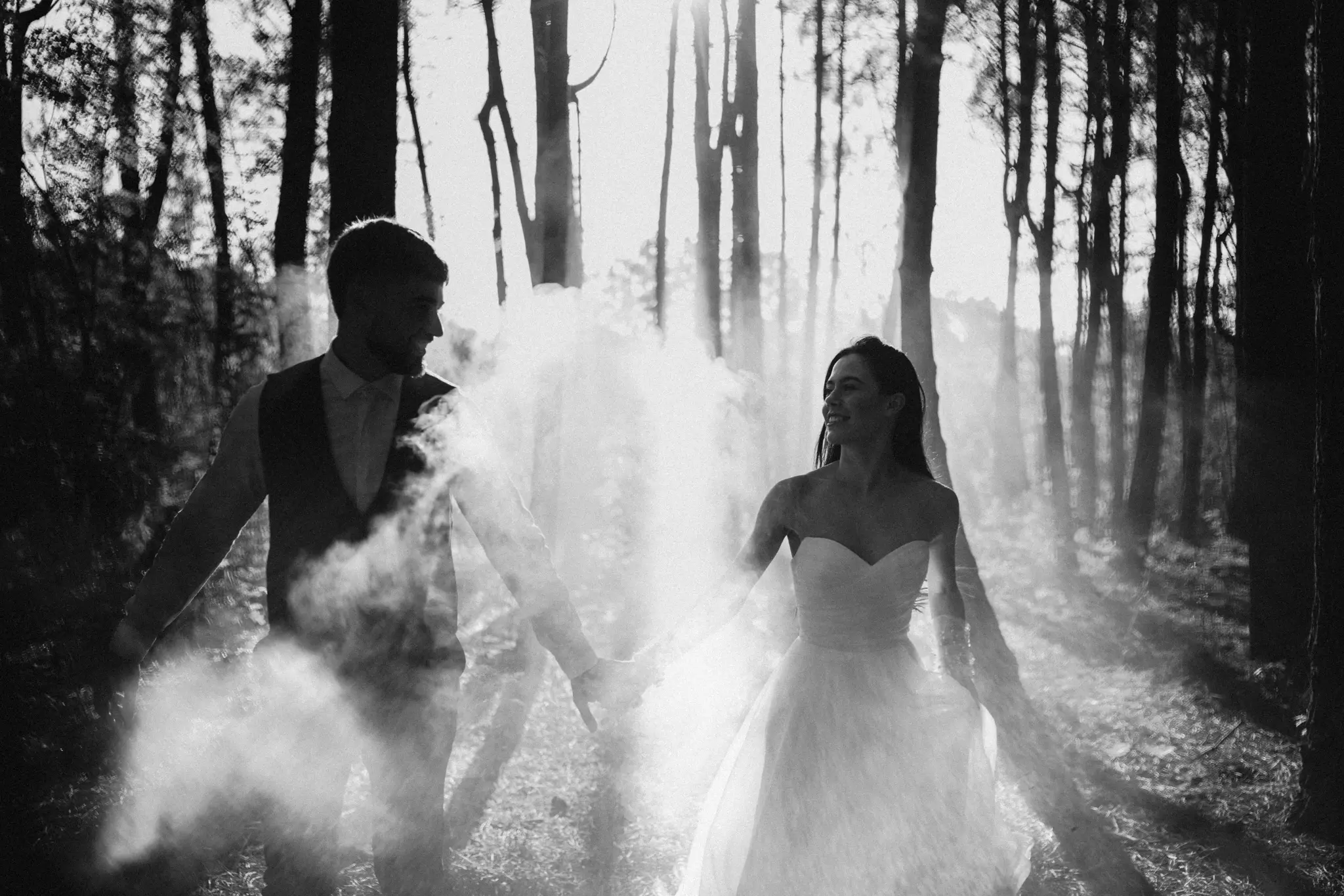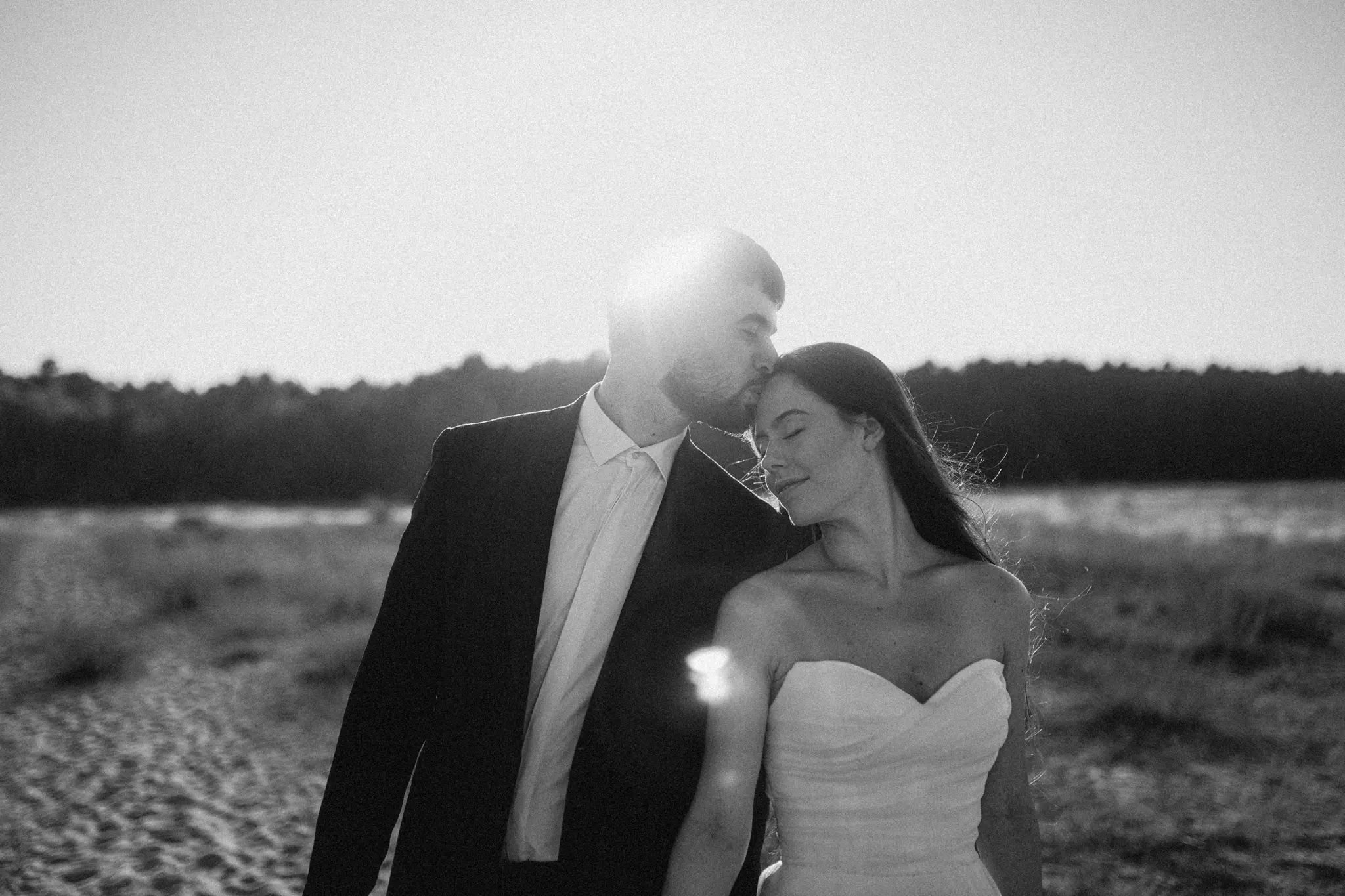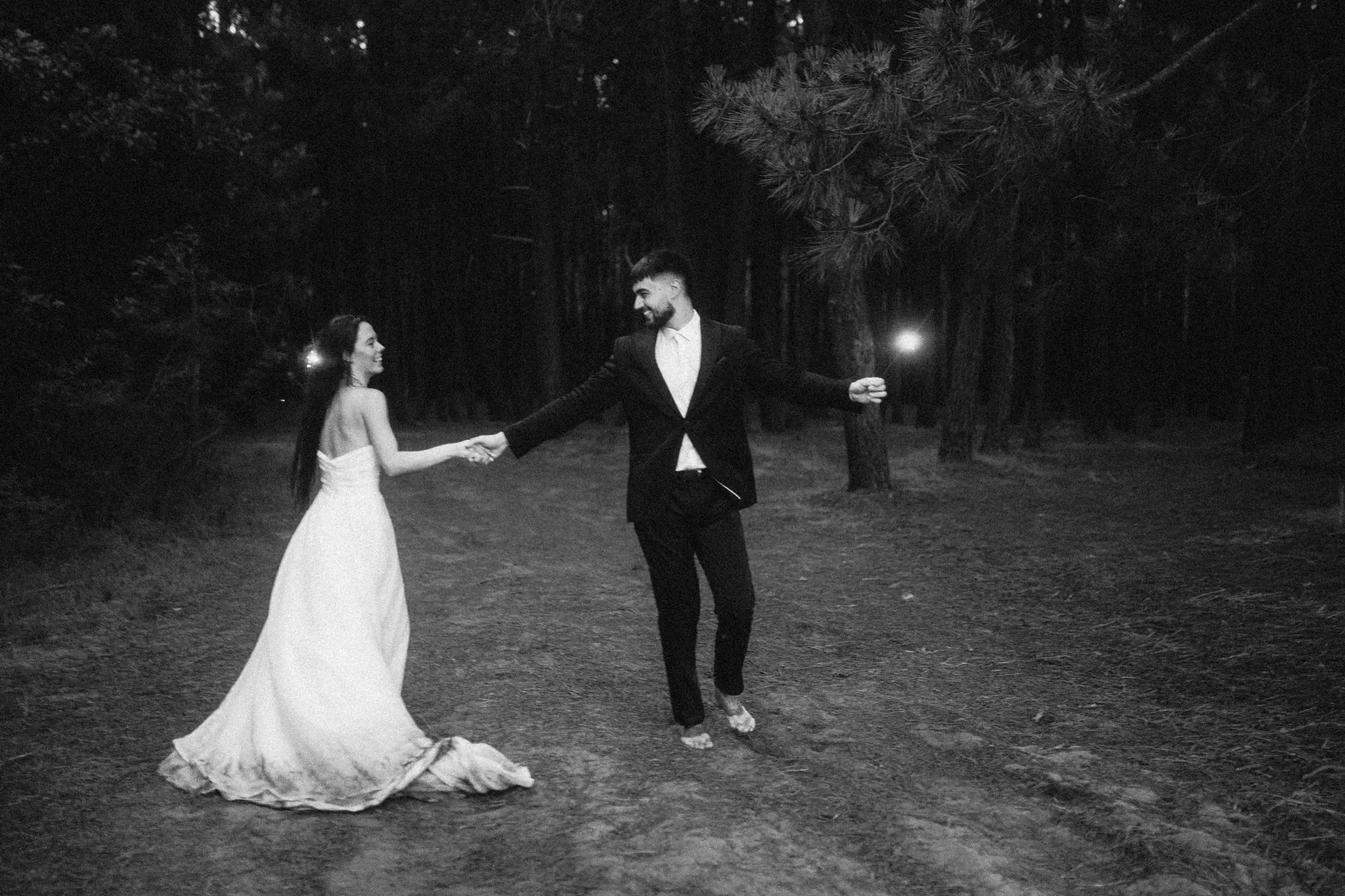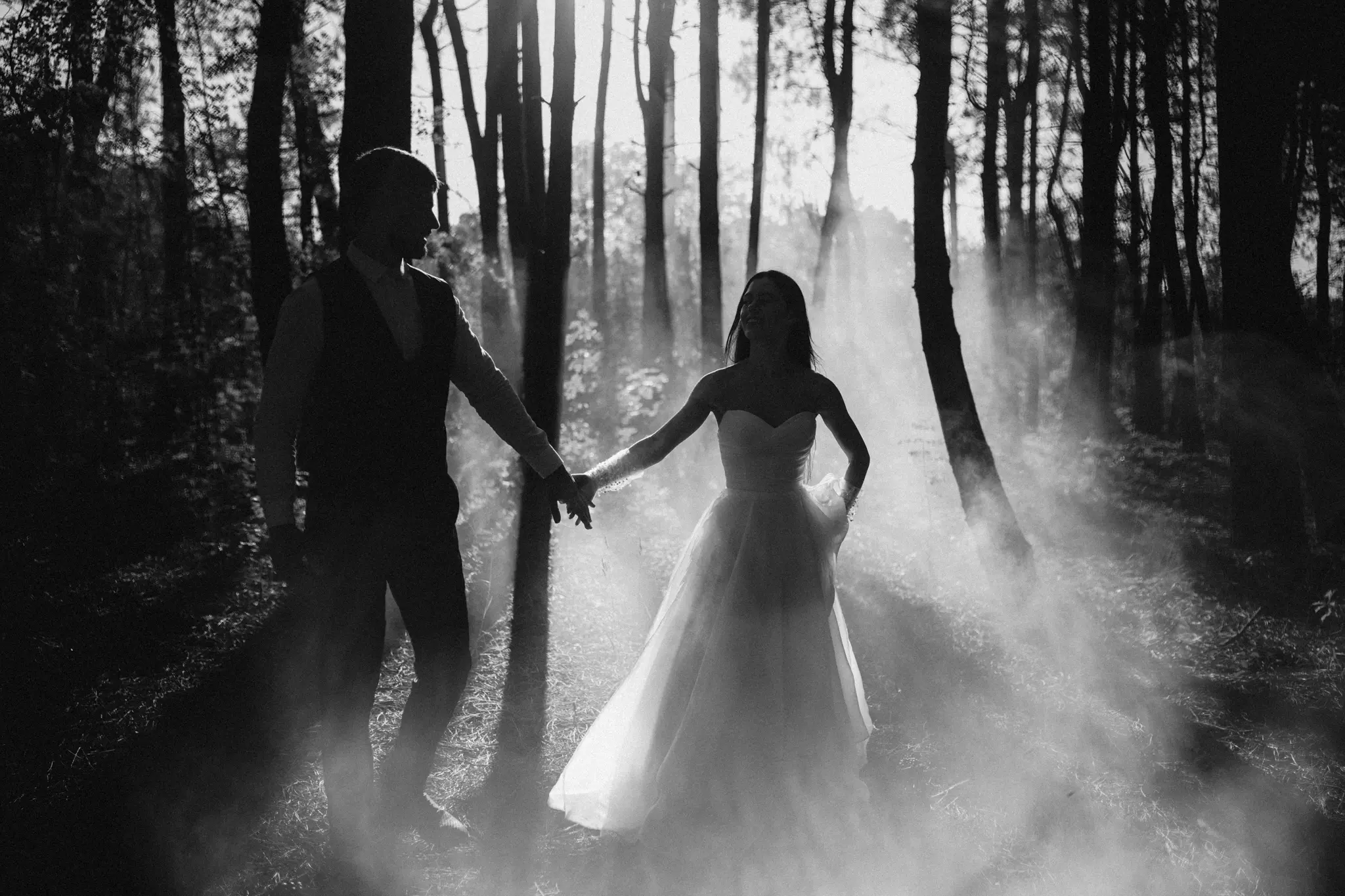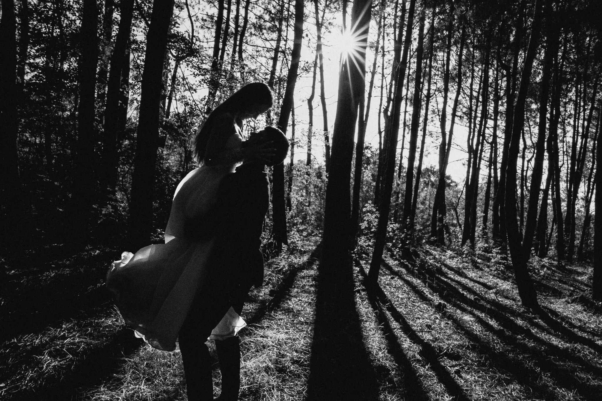 СледСватбена фотосесия в гората и плажа в черно бяло
