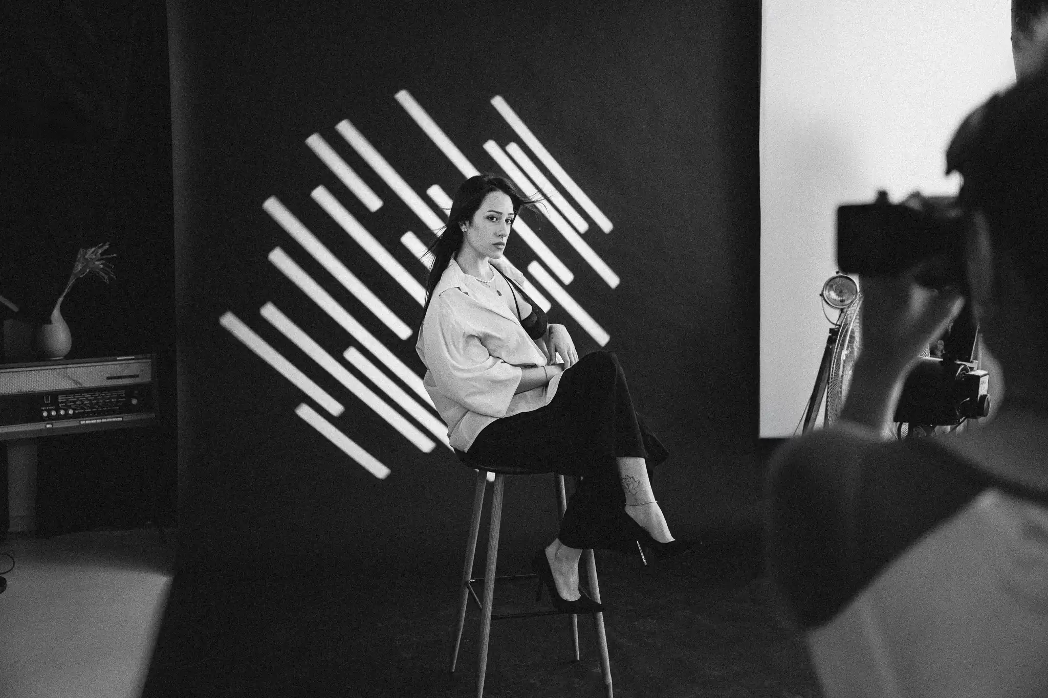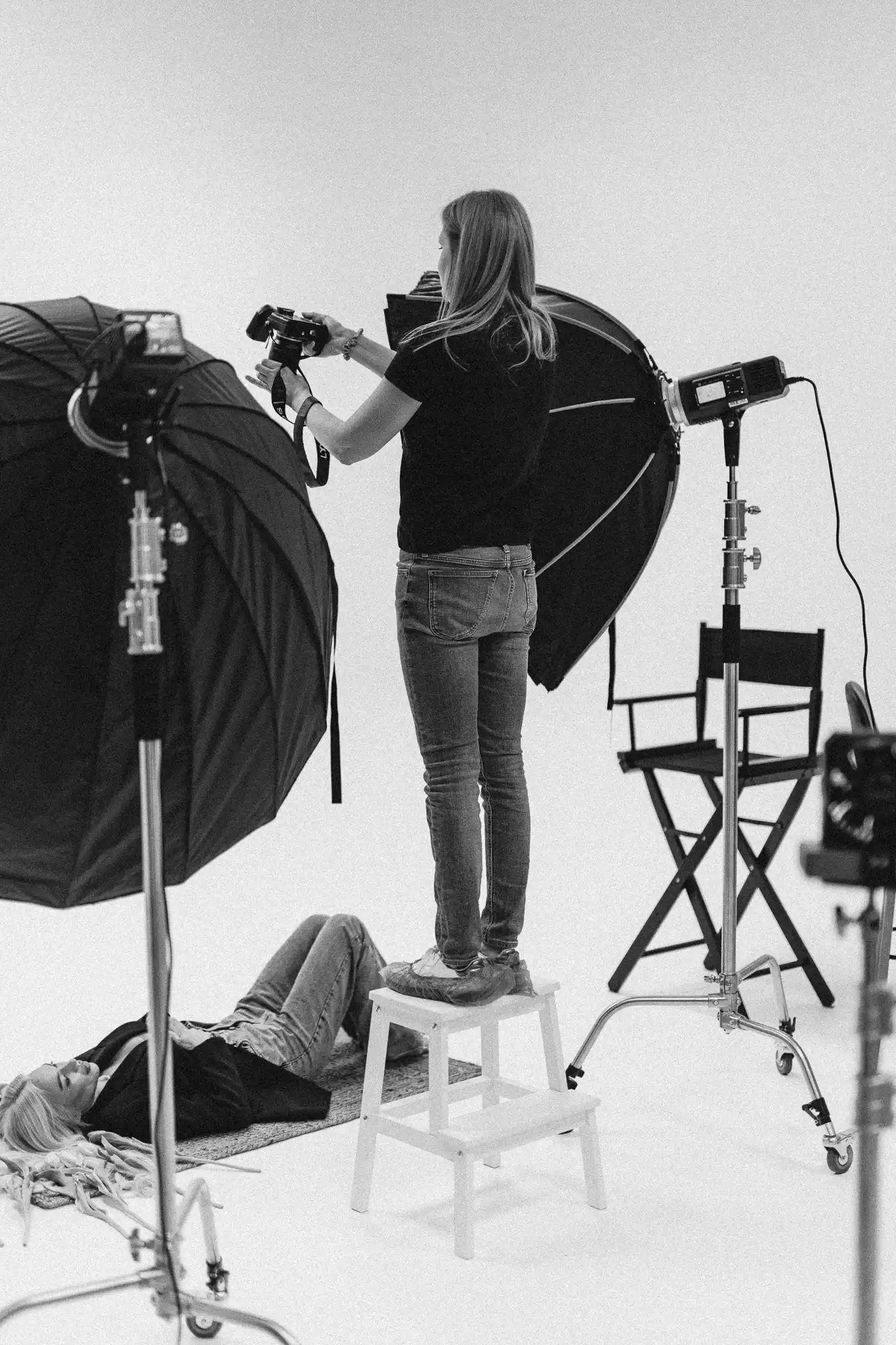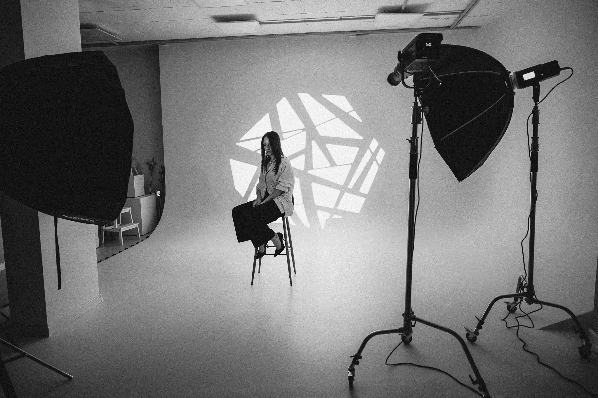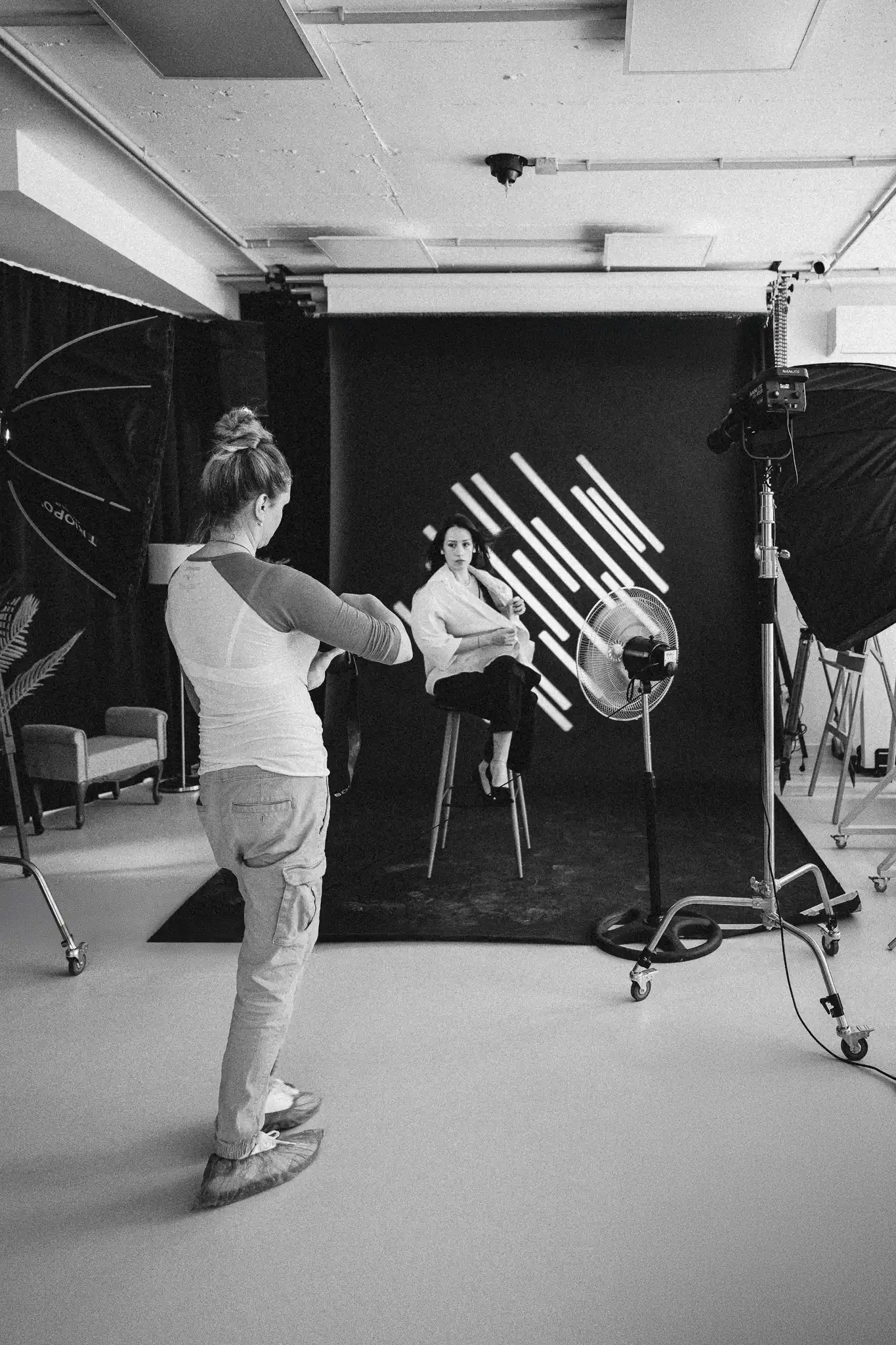 За постигане на разнообразни визуални ефекти са приложени гобо маски, а вентилатори са използвани за създаване на обем и движение в косата. Фотосесията е реализирана с различни хартиени фонове и бяла циклорама, което позволява чисти, минималистични и артистични портрети.