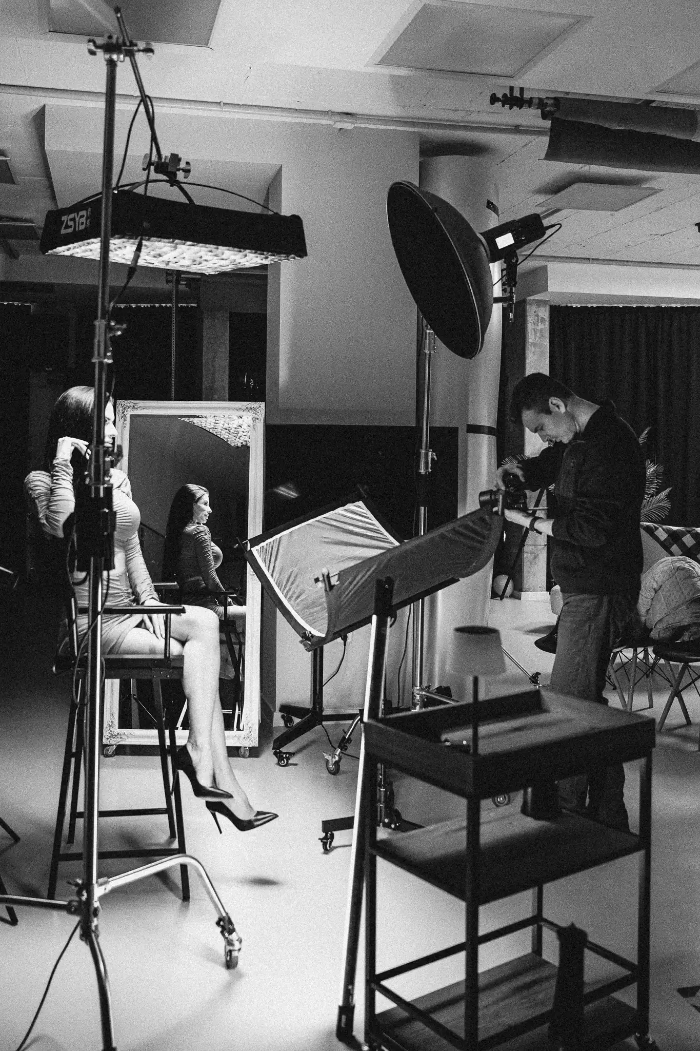 По време на снимките са използвани различни осветителни тела и софтбоксове за прецизен контрол на светлината, както и комбинация от импулсно и постоянно осветление, допълнени от естествена светлина. За постигане на креативни ефекти са приложени гобо маски, а вентилатори са използвани за добавяне на движение и обем в косата.