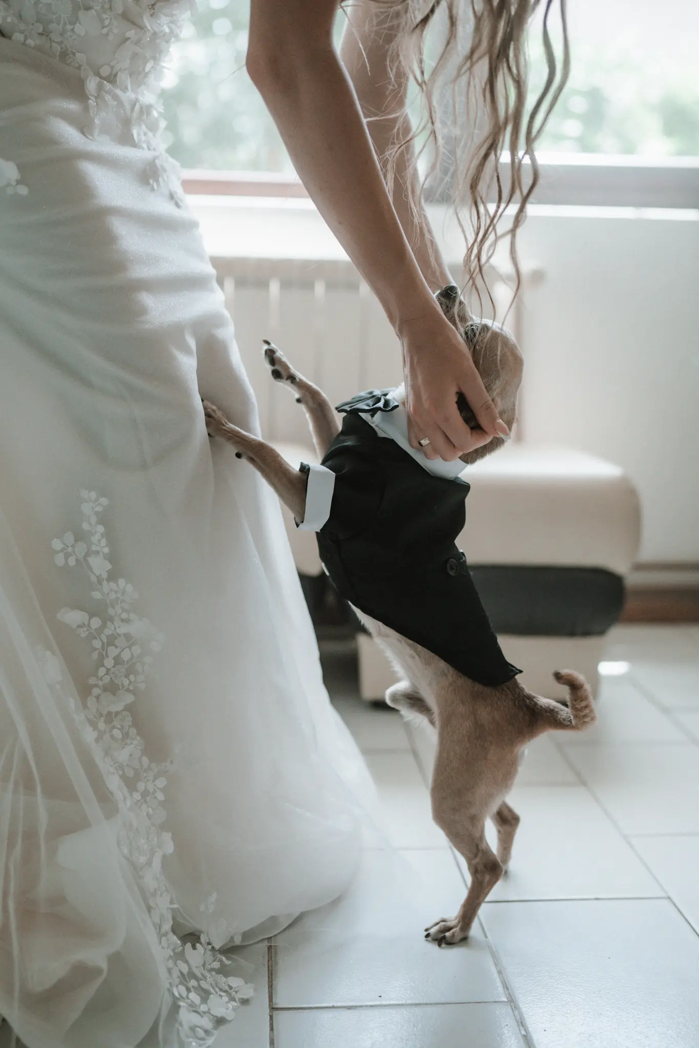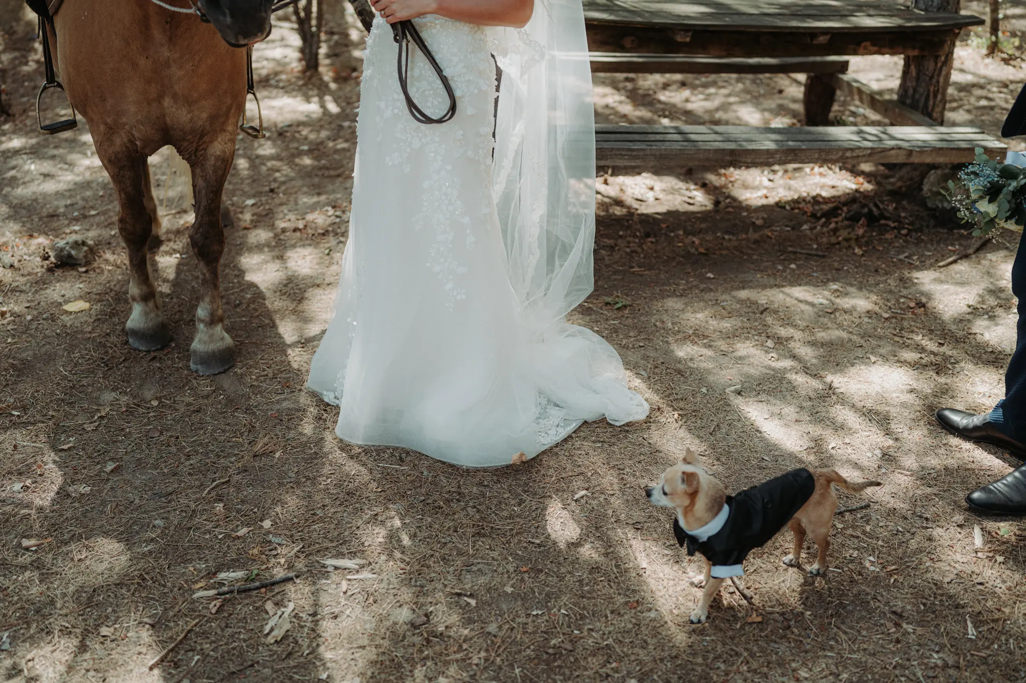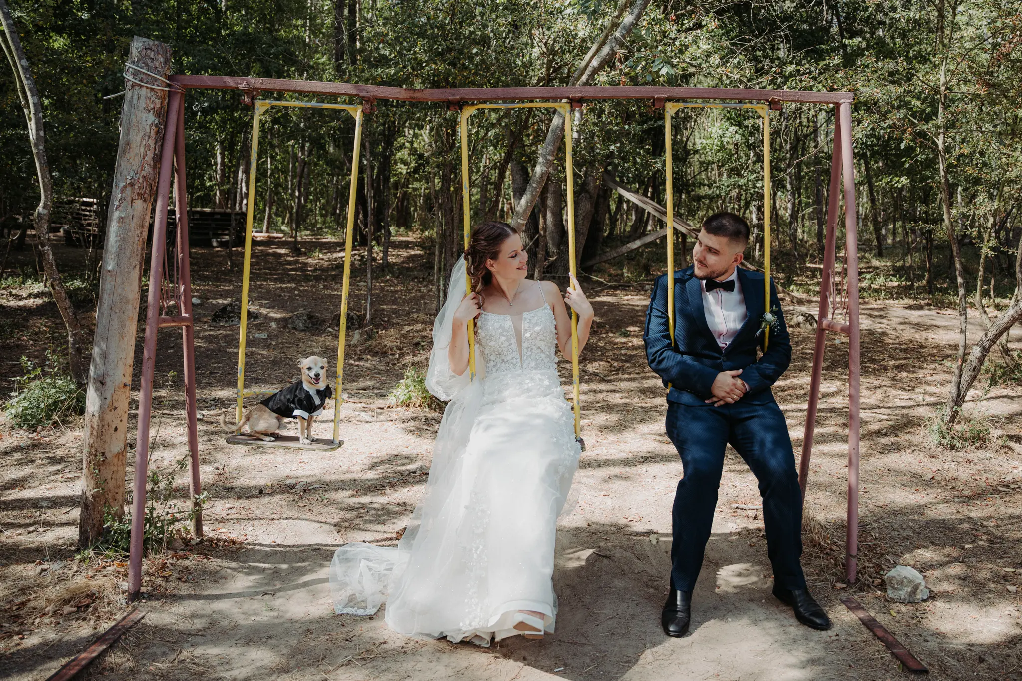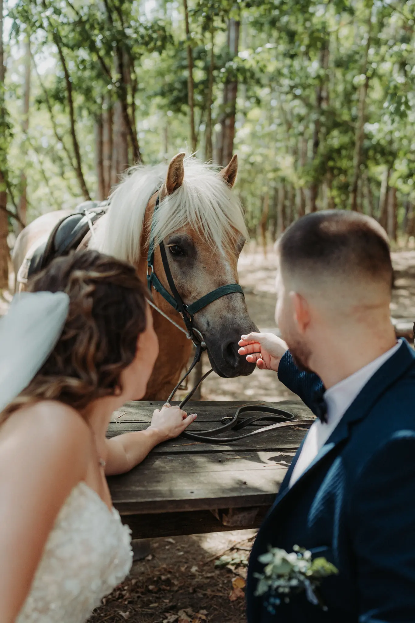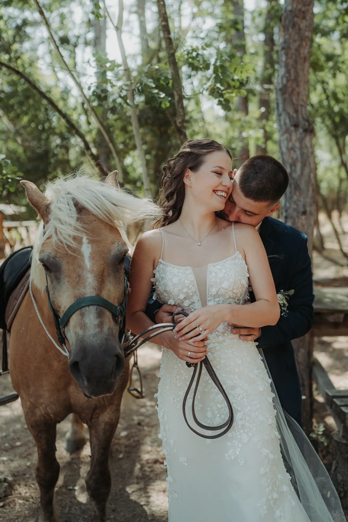 Сватбеният ден започна с подготовка на булката у дома и романтична фотосесия в гората, където бяхме с техния малък домашен любимец, а там срещнахме и едно конче – детайл, който придаде уникален характер и силна емоция на сватбената фотография. Природата, естествената светлина и присъствието на животните създадоха автентични, нежни и запомнящи се кадри, идеални за артистична сватбена фотосесия.