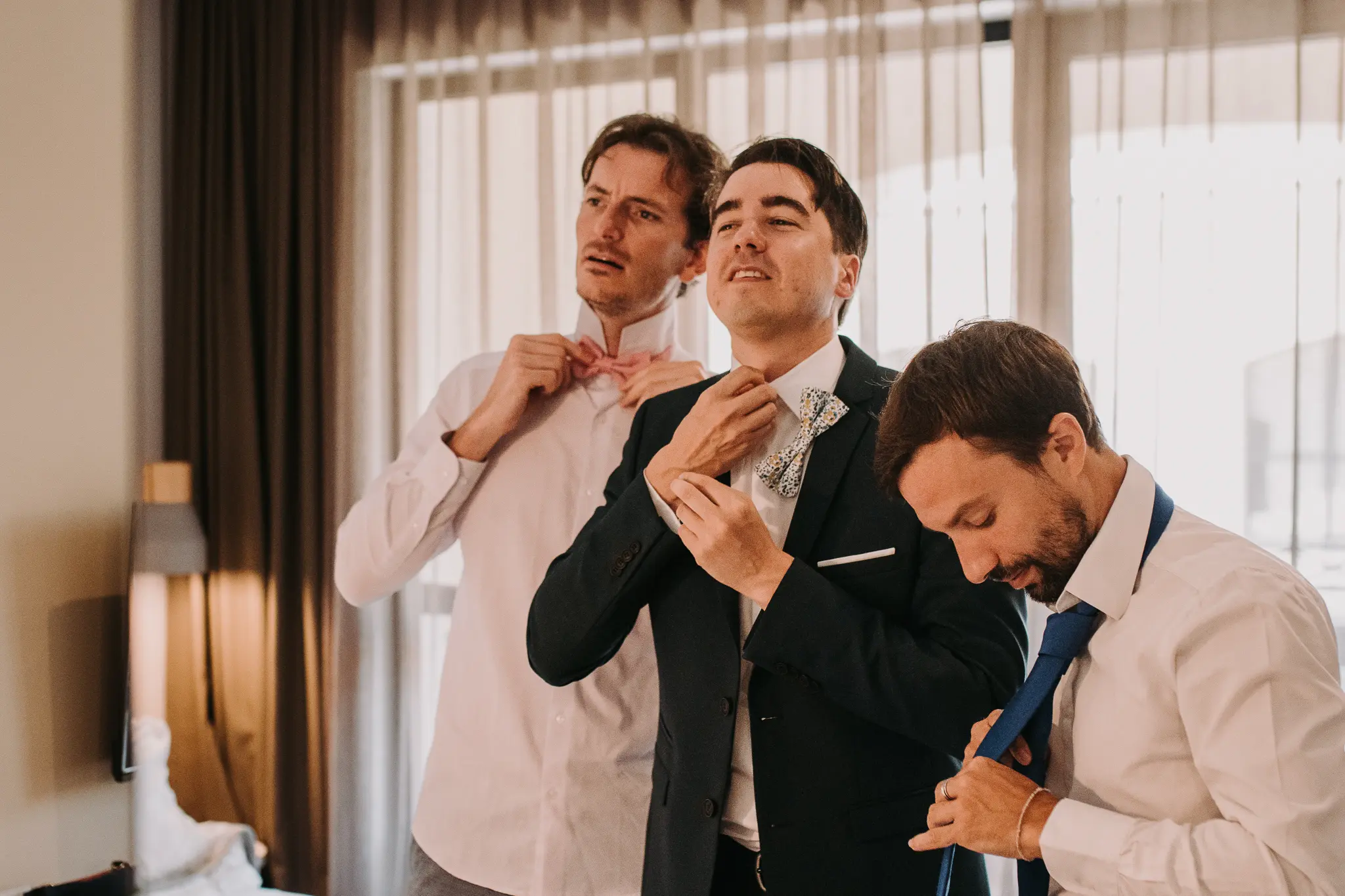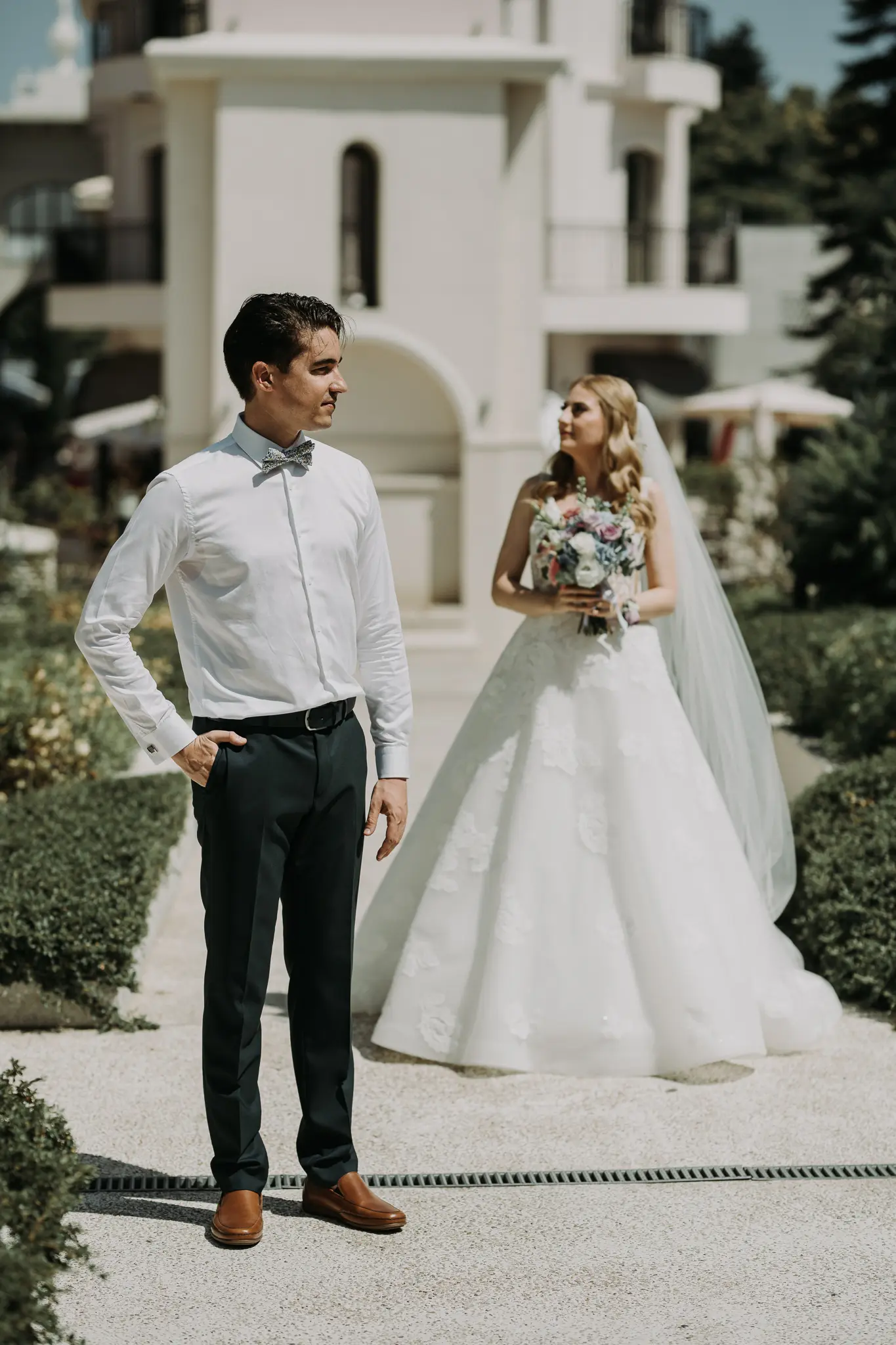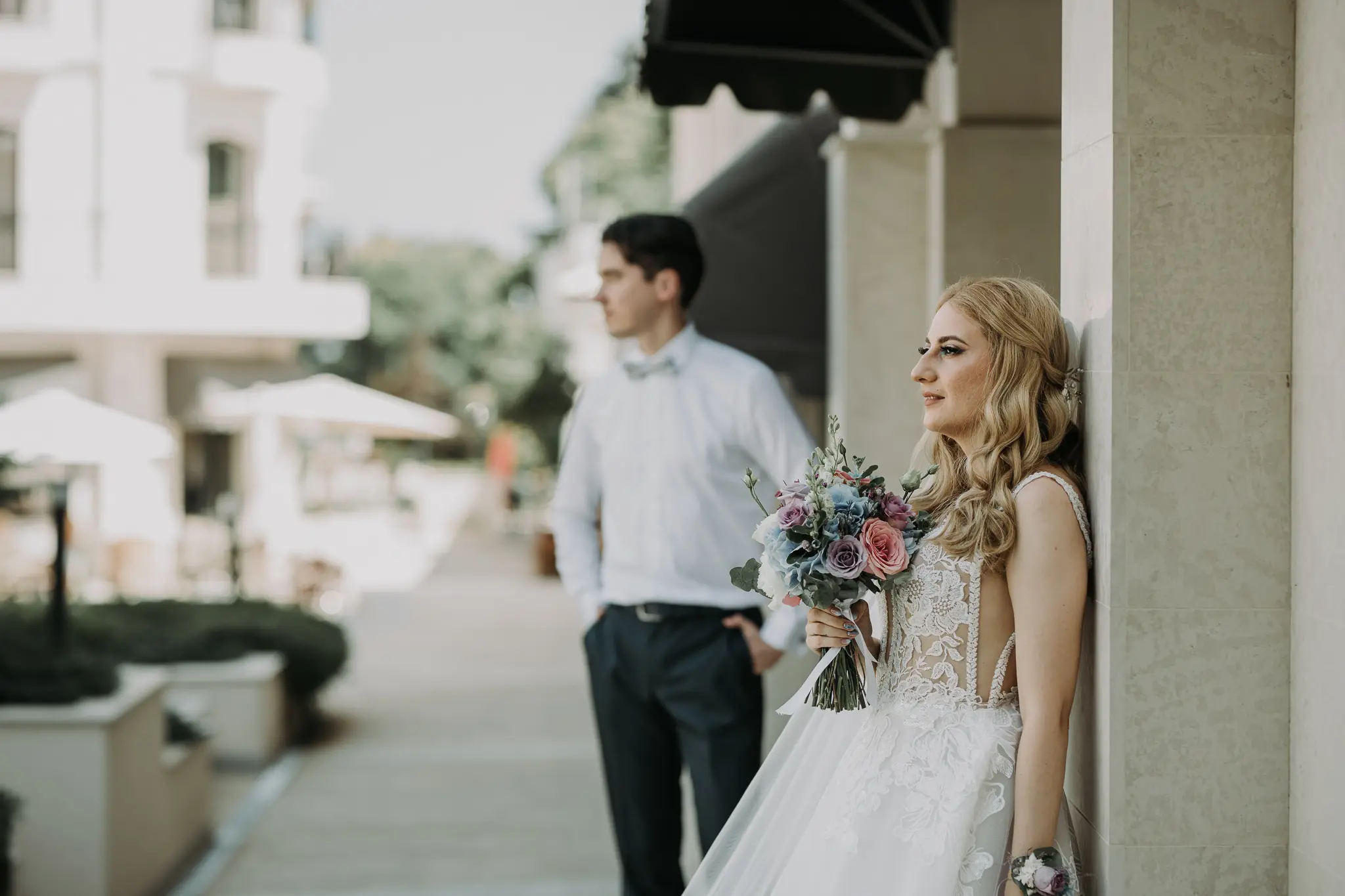 Сватбеният ден започна с приготовленията на булката и младоженеца в Хотел Приморски, където морската атмосфера и спокойствието създадоха идеален старт за емоционална и стилна сватба. Тези моменти са изпълнени с вълнение и са важна част от цялостната сватбена фотография.