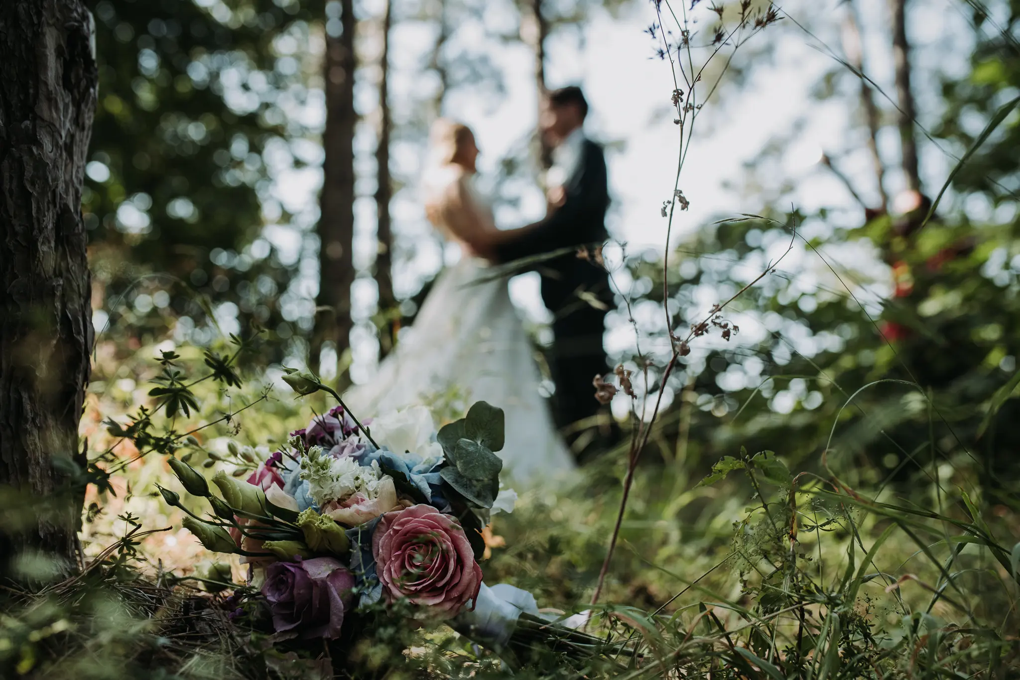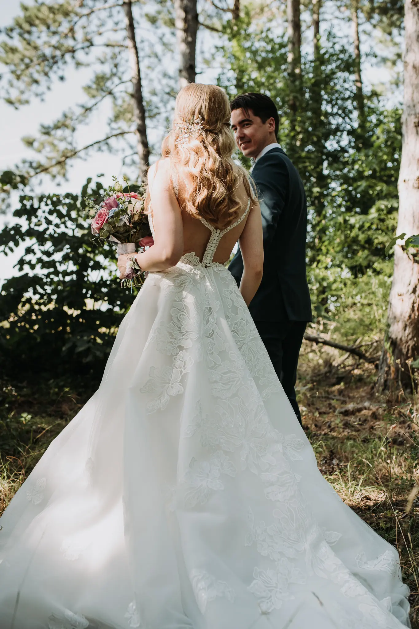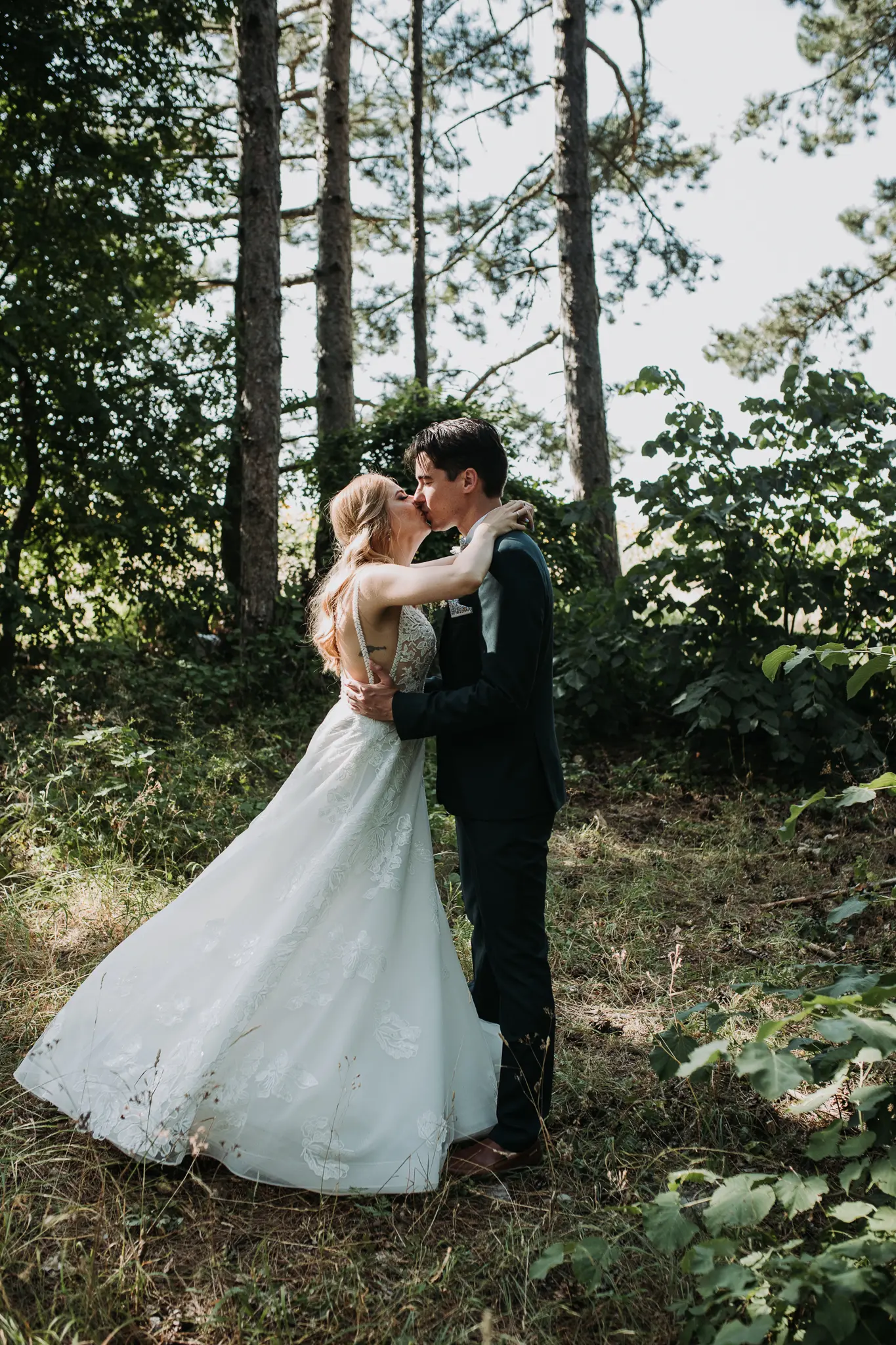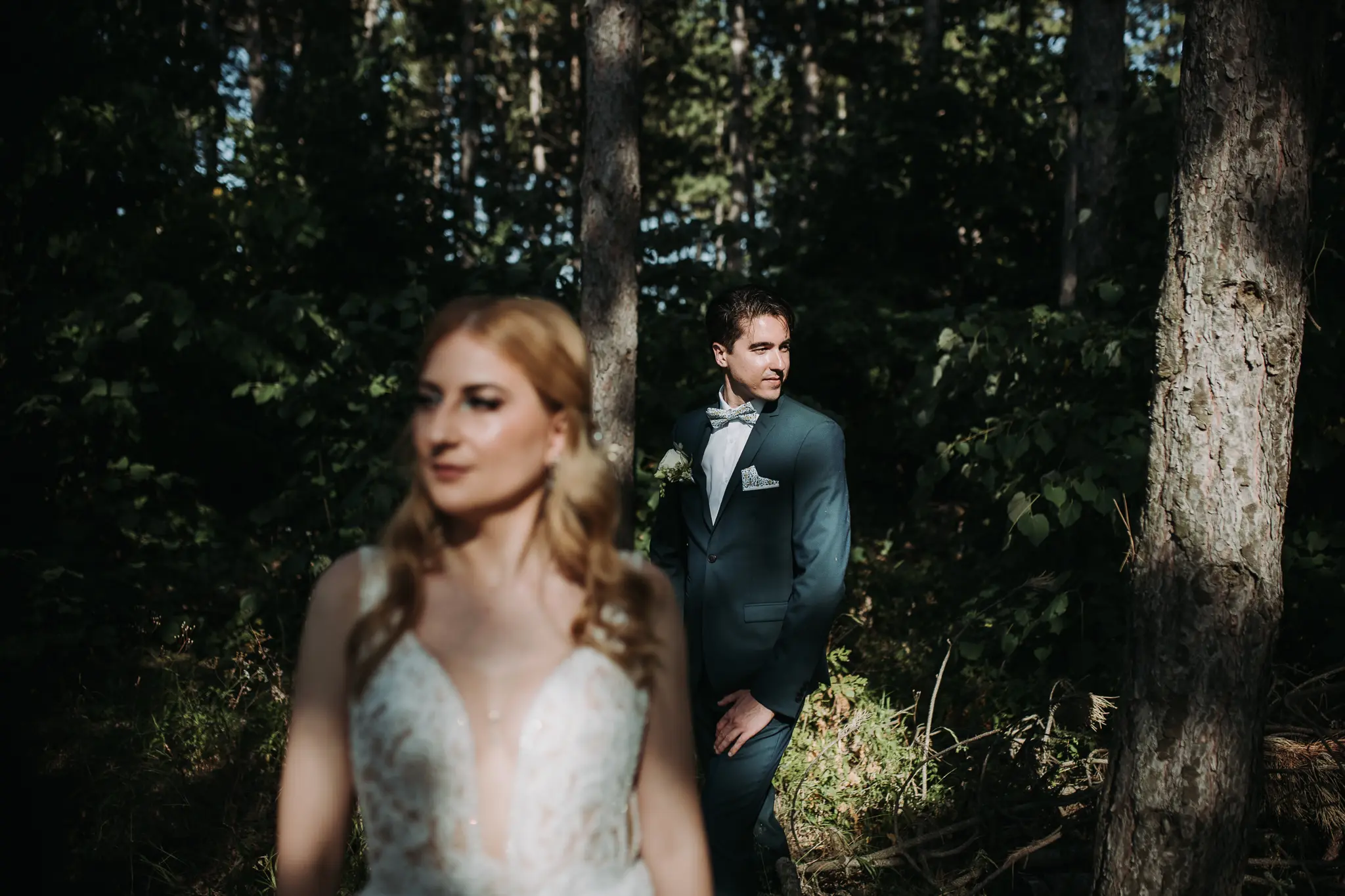 Фотосесията в гората добави романтика и естествена красота. Зеленината и меката светлина оформиха нежни и артистични сватбени кадри.