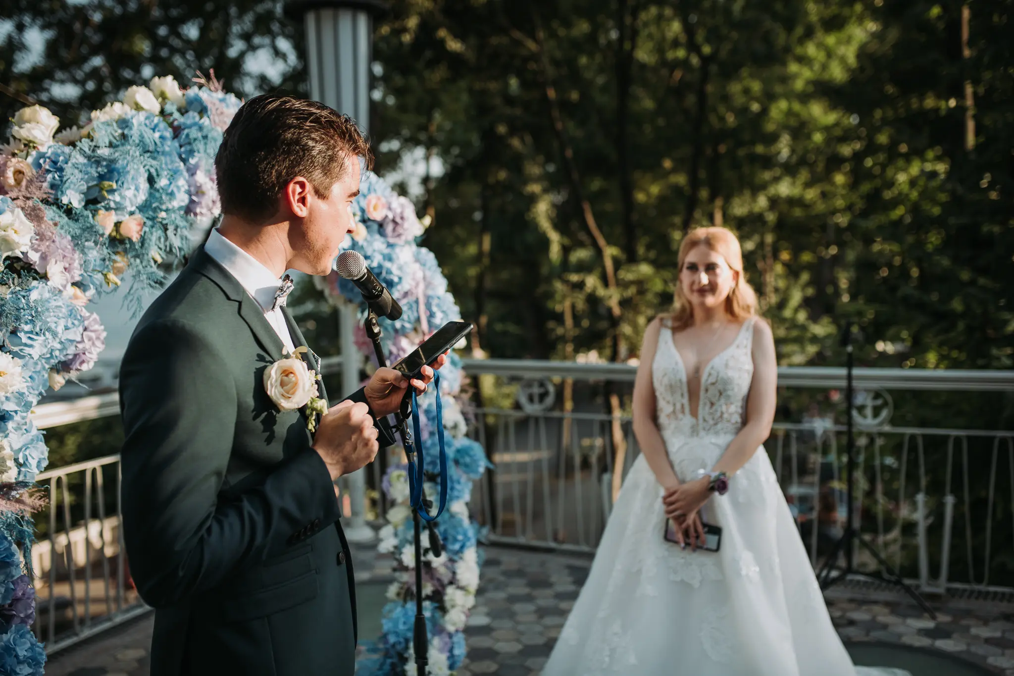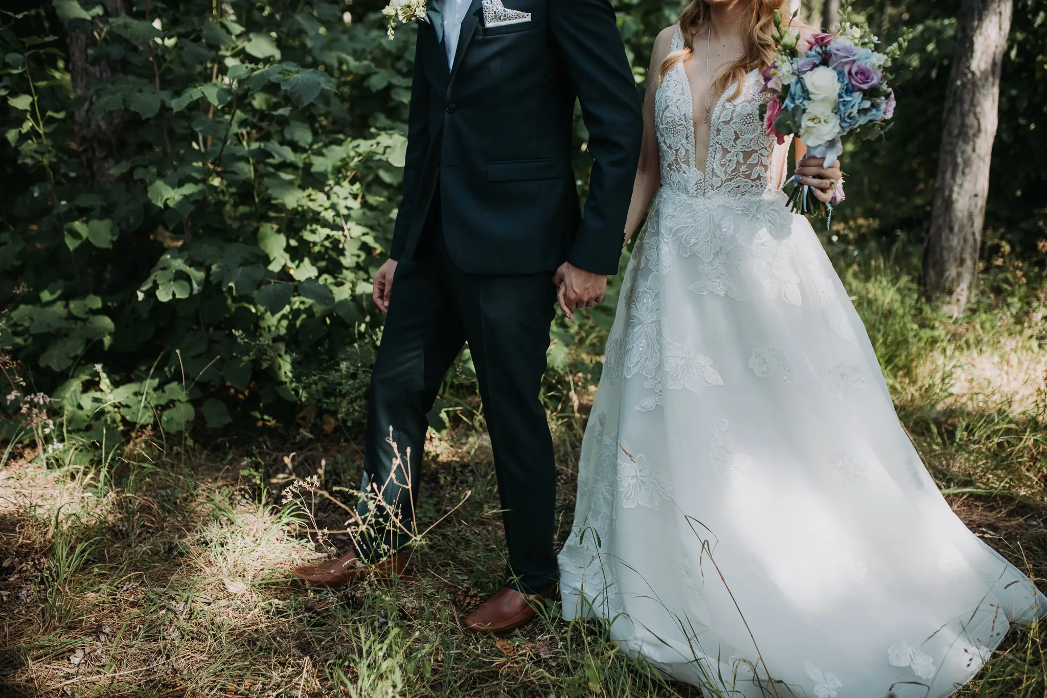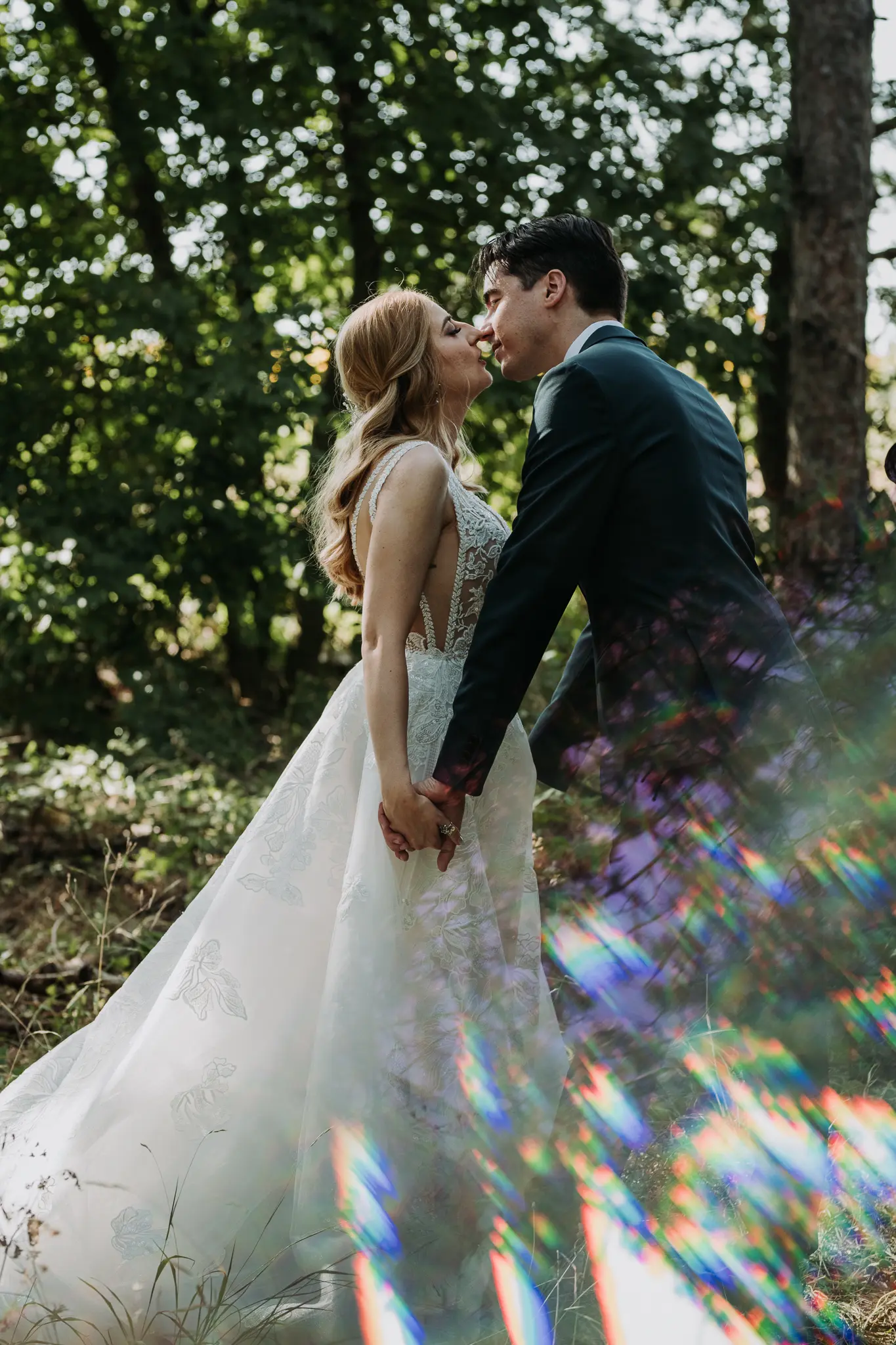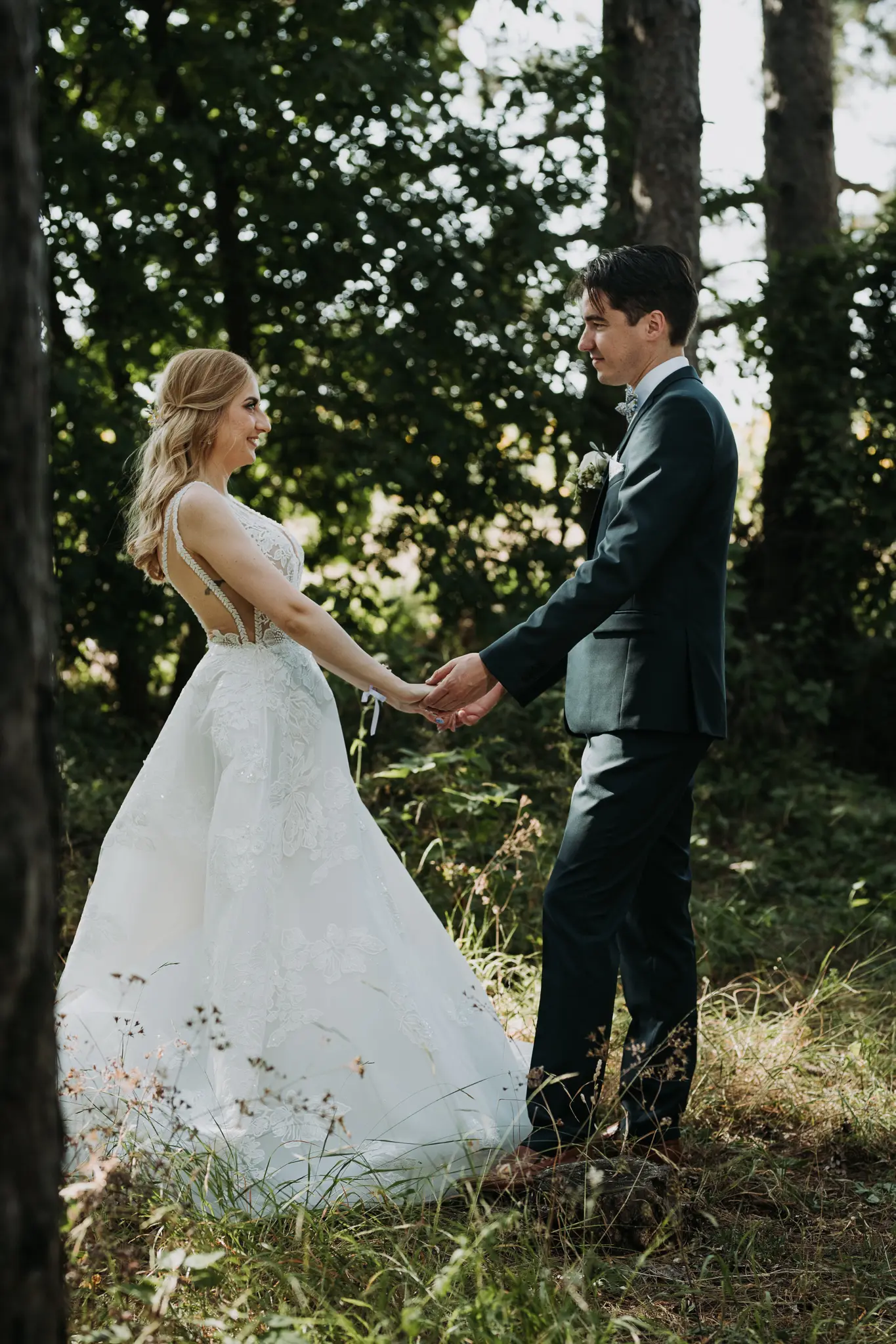 Фотосесията в гората добави романтика и естествена красота. Зеленината и меката светлина оформиха нежни и артистични сватбени кадри.